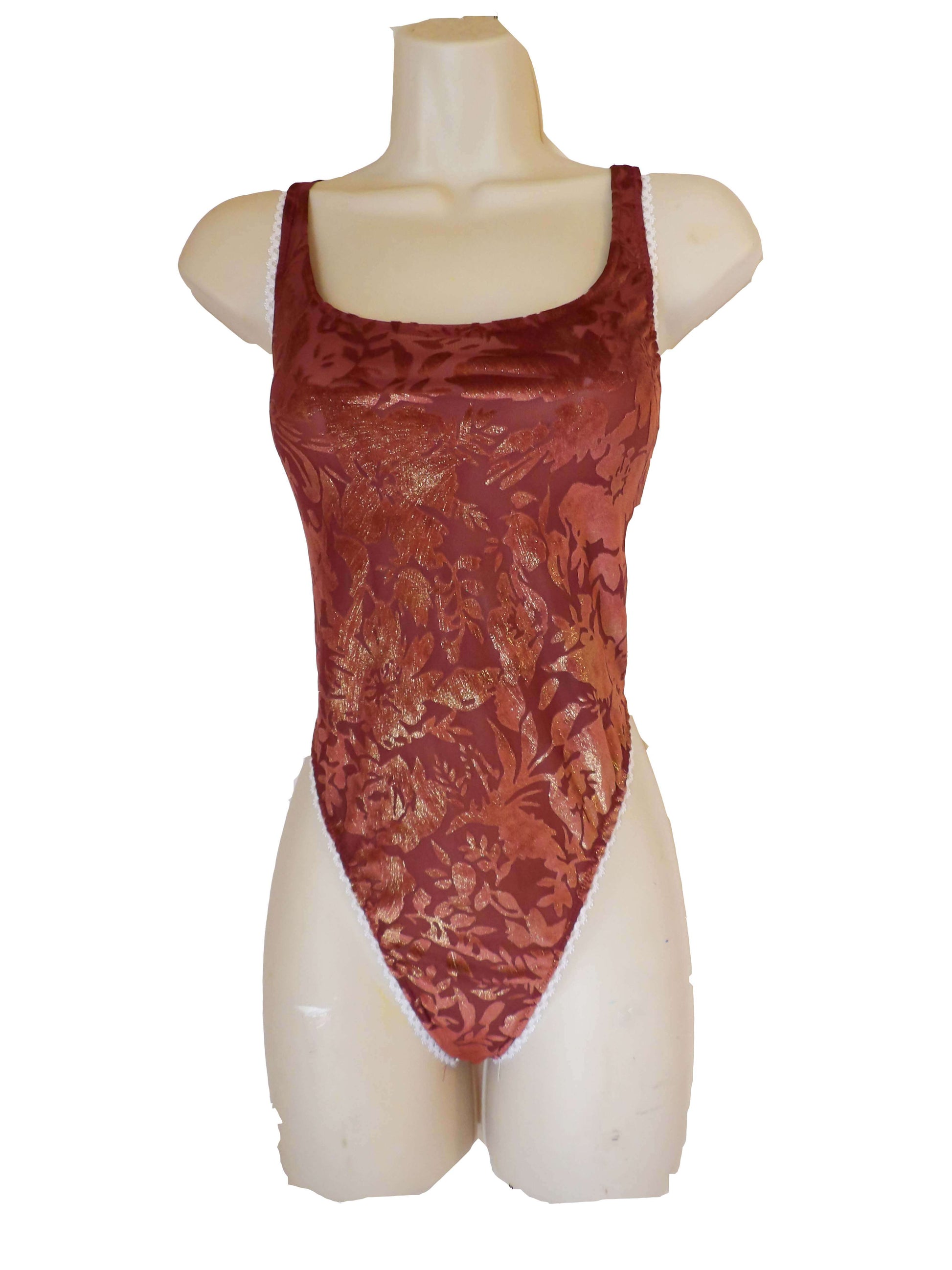 Burgundy and gold Flowers Sheer Hooded Thong cut Bodysuit