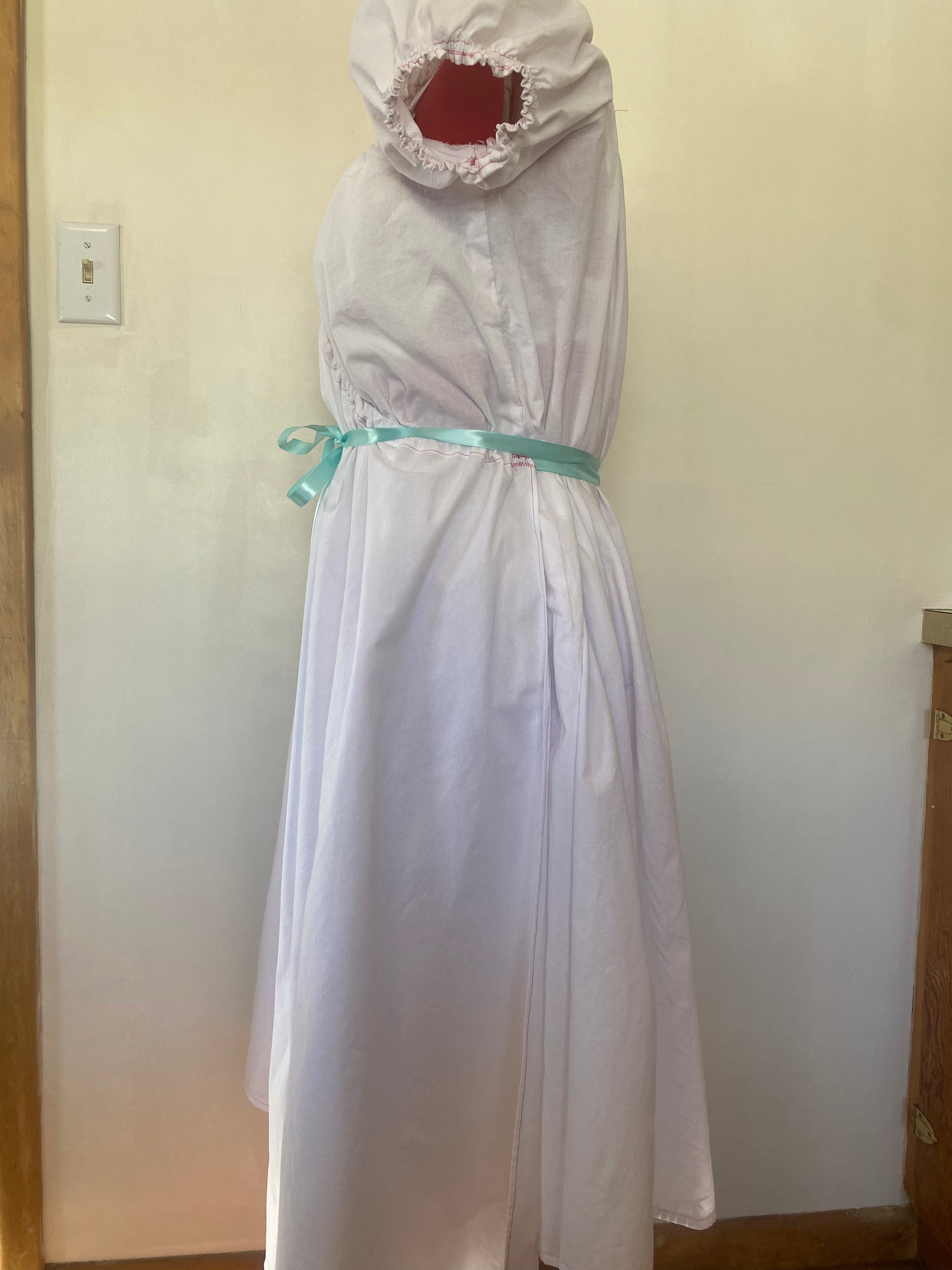 The mock-up dress features baste stitches in contrasting thread, so that I can easily rip these stitches out and use each as patterns for the final dress. The basted stitches are stable but not permanent type of stitches, and ribbon has been used in place of the ties to save expense. The final dress will have fabric ties in place of the ribbons. The sleeves differ slightly from each other so that we can determine which you prefer.