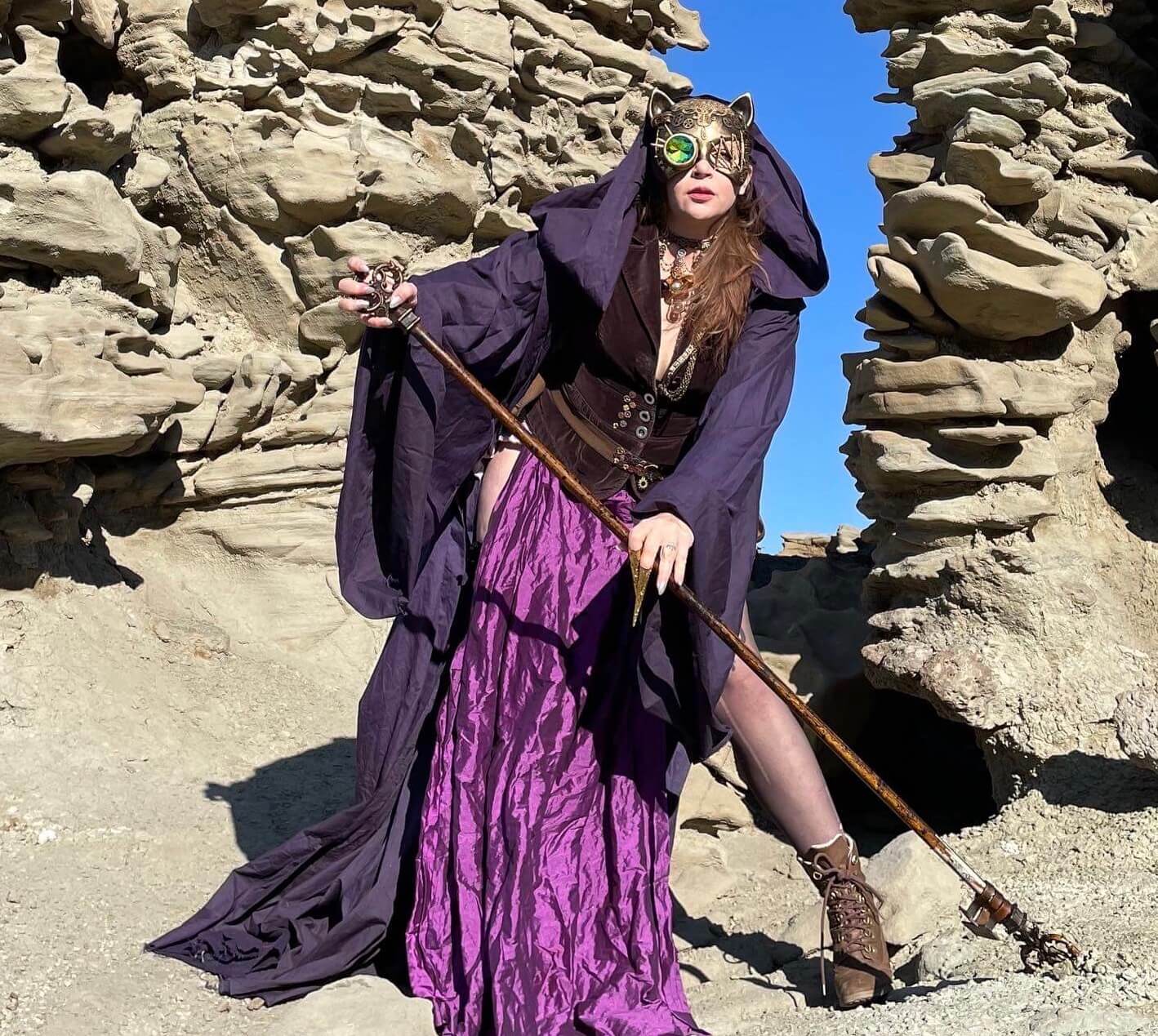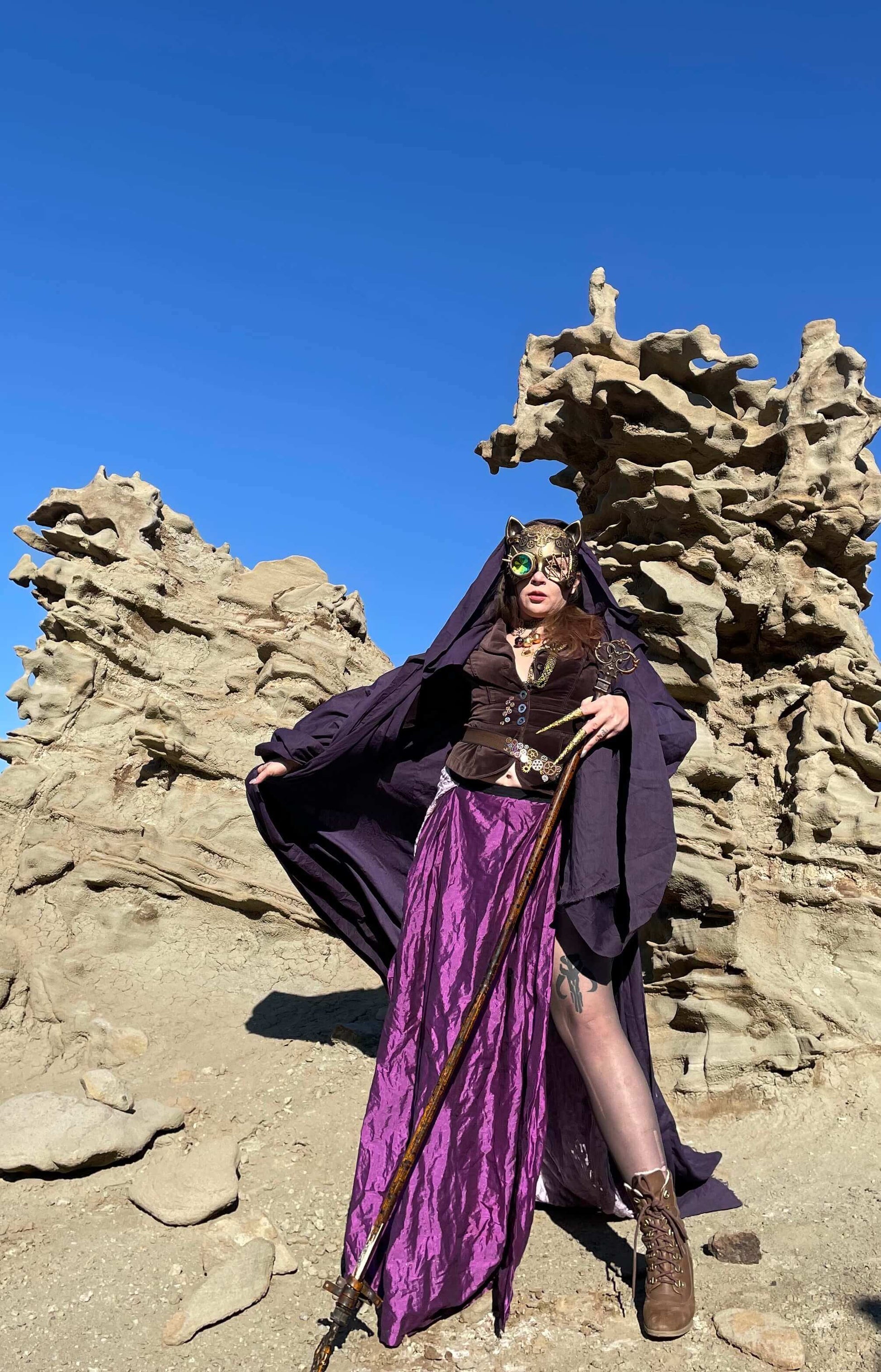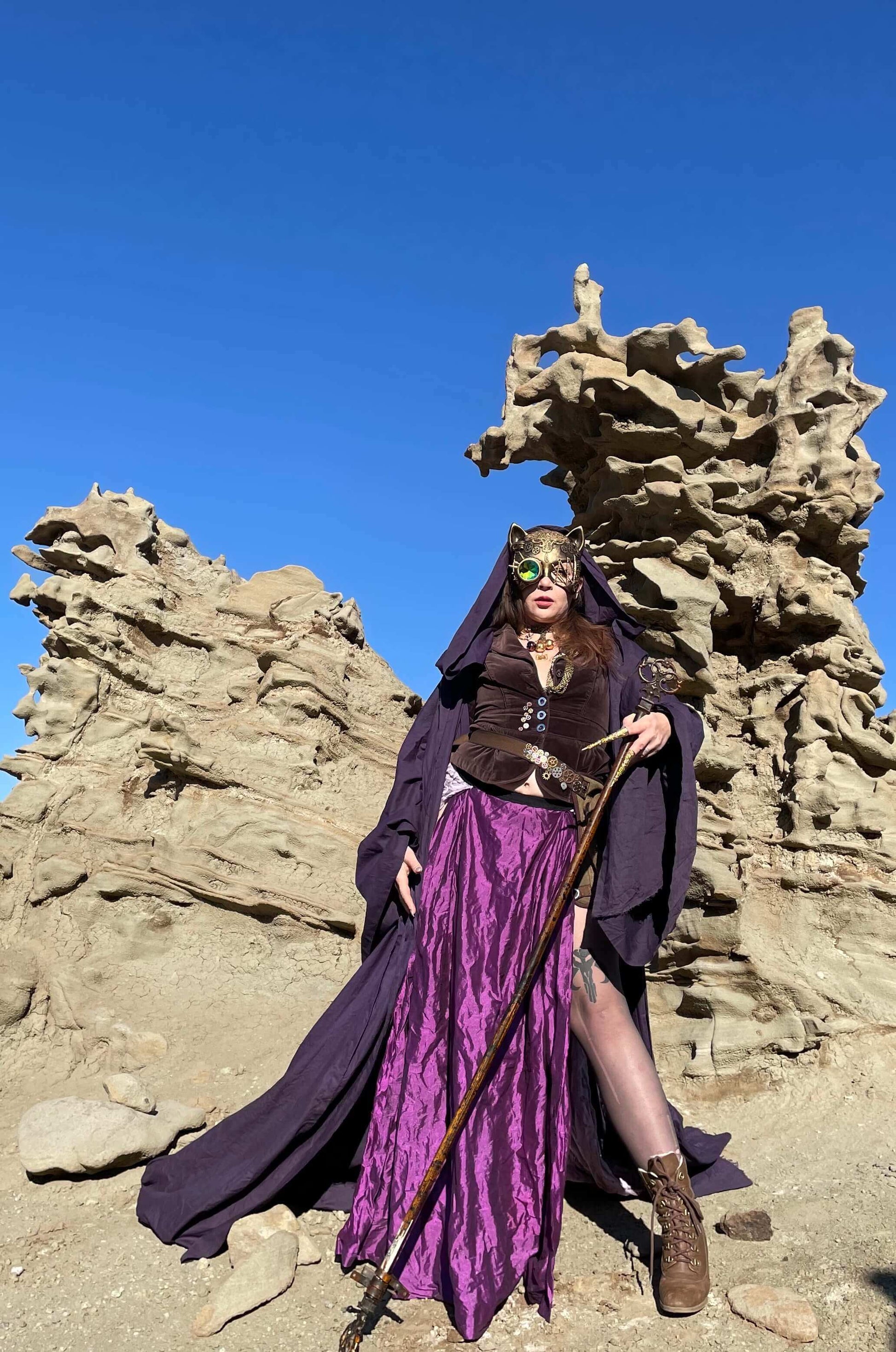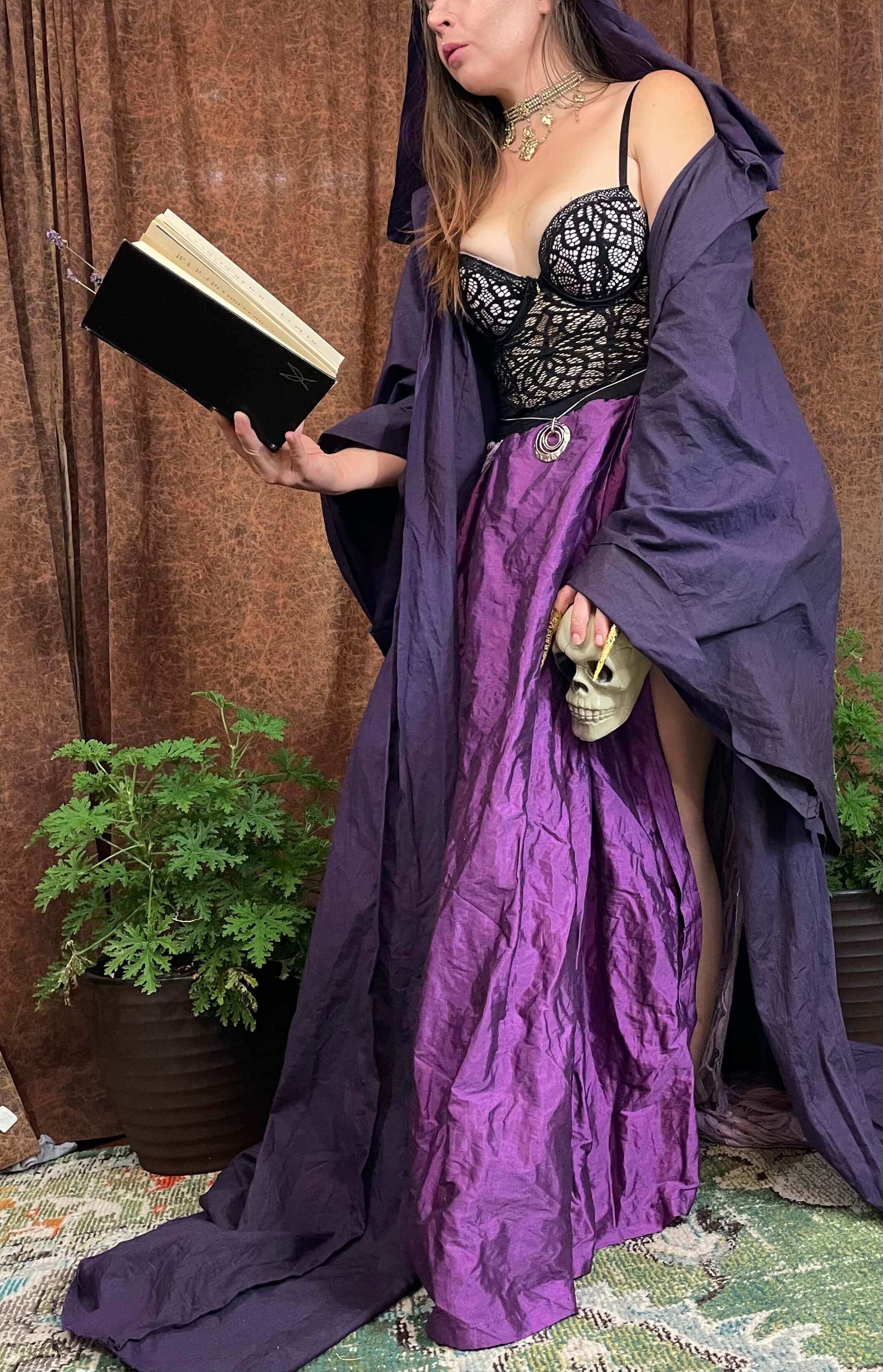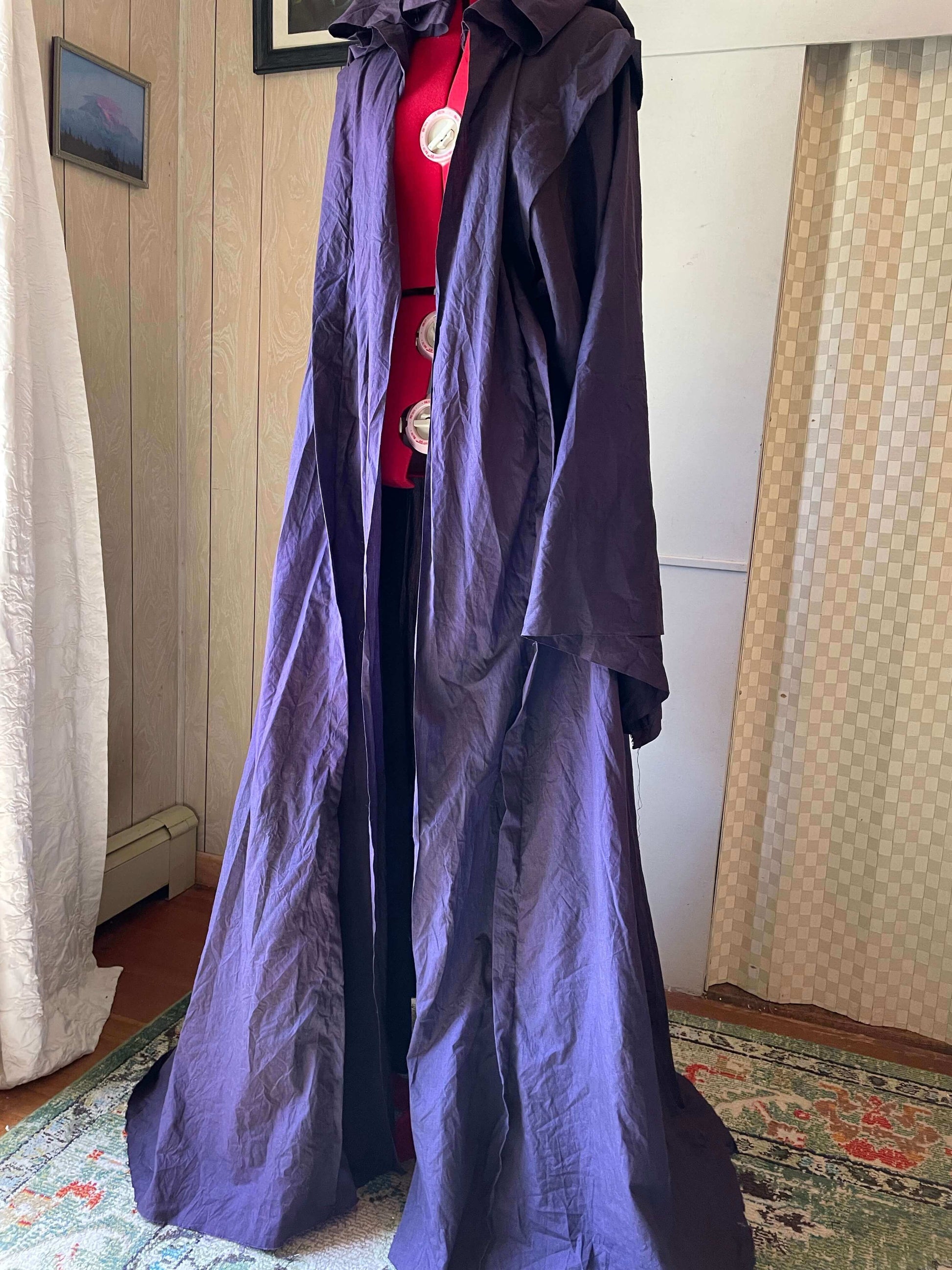 Feel your most mysterious under this giant purple hooded occult cloak! This robe is very elegant and moves with the wearer very fluidly as it is long drapes in a bell like silhouette. Cosplay quality, very real folds and draping, accompanied by the classic oversized hood, perfect for brooding or casting spells under!