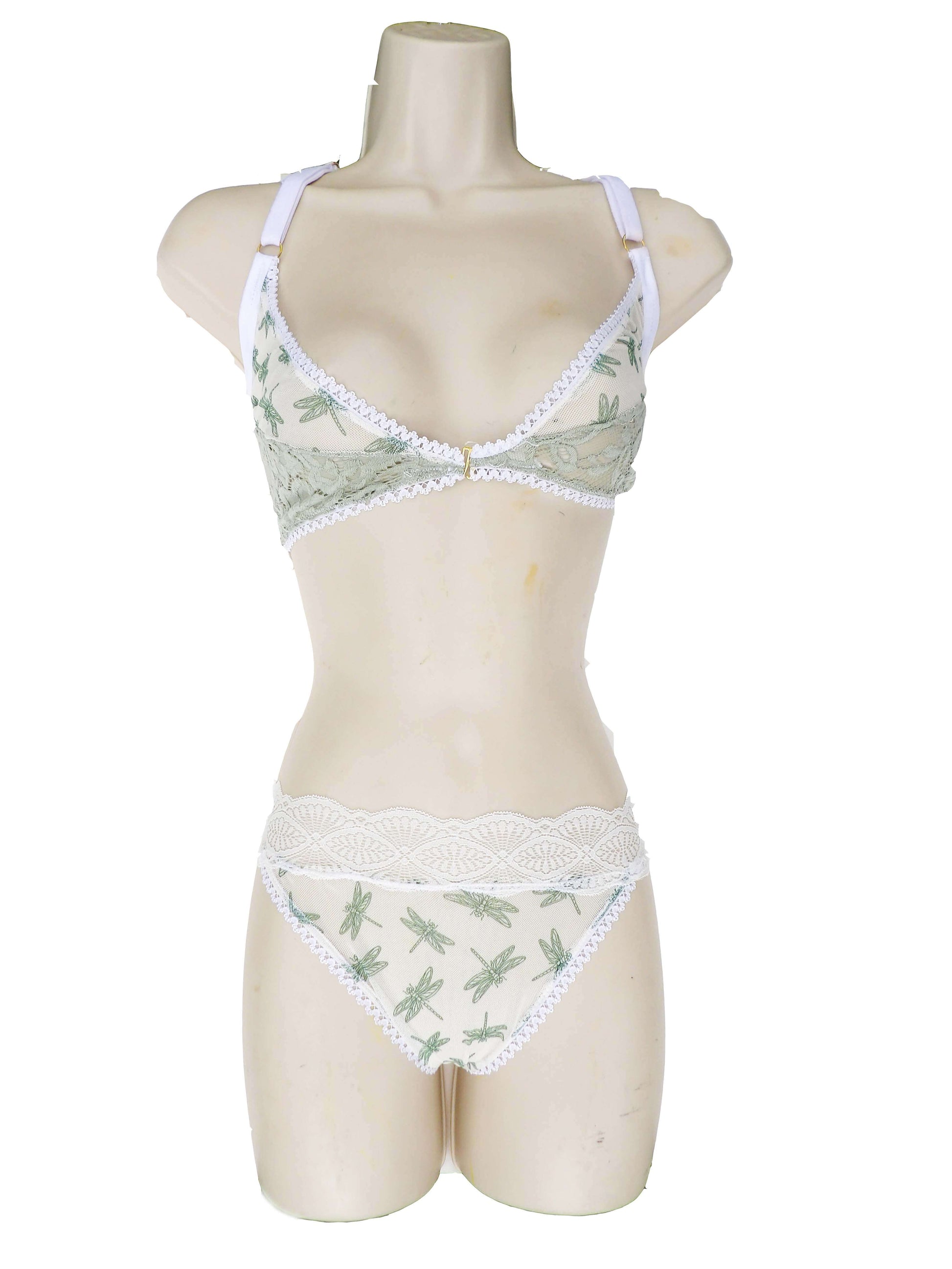Our Dragonflies and Floral Fully Sheer Essentials Bralette is a soft and cute comfort wear essential, featuring delicate dragonflies on sheer mesh fabric in front and floral luxury lace in light okra color, with soft adjustable, convertible straps. Front Closure.