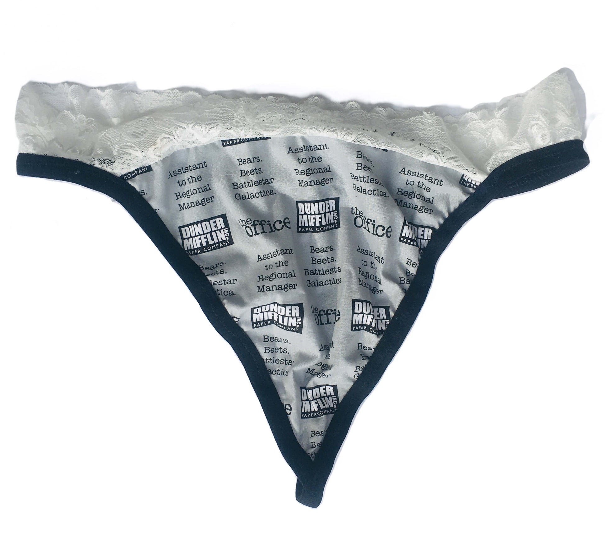 Our Dunder Mifflin Black Lace G-String Thong is the ultimate sexy everyday essential, featuring a witty, fun The Office themed fabric. This medium rise, soft and sexy set of undies is both incredibly comfortable and uniquely sexy! The soft black lace is the highest hand dyed quality, made to last and be comfortable!