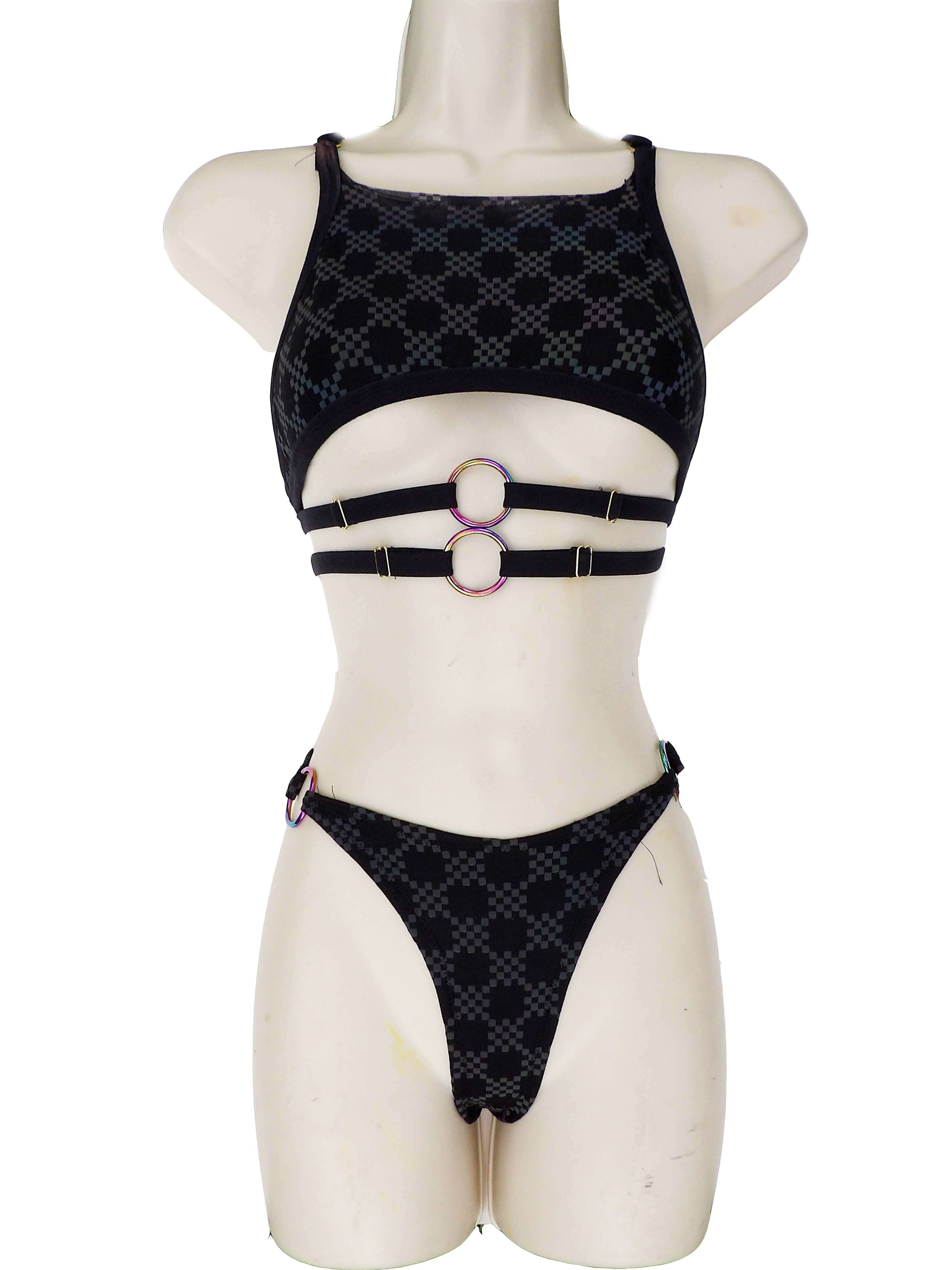 Our Mini Checks Super Strapped Halter Top is a futuristic fantasy! Featuring an adjustable mini halter in a mini checks pattern in matte iridescent rainbow on black on jersey knit fabric. Fully adjustable double O ring underbust detail, with brush metal Rainbow and rose gold hardware. Back closures.