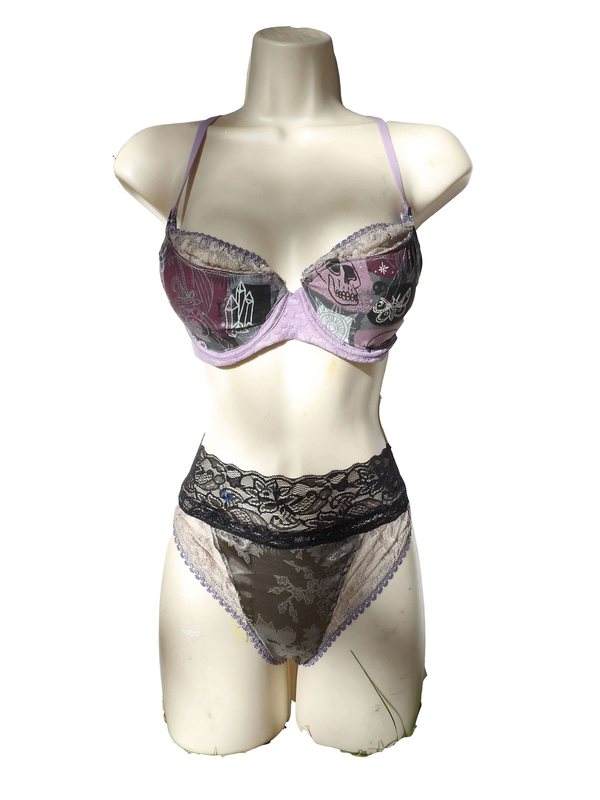 Our Mystical in Lace Half Cup Demicup Bra Tshirt Bra Is the ultimate everyday geek gear essential, featuring mystical and magical purple print fabric, gray luxury lace peekaboo cutouts at top of cup, in a flattering and flirty cut. This low-cut and unique, balconette is comfortable and flattering. The cups are lightly lined, so it looks great under attire, but so fierce and flattering without!