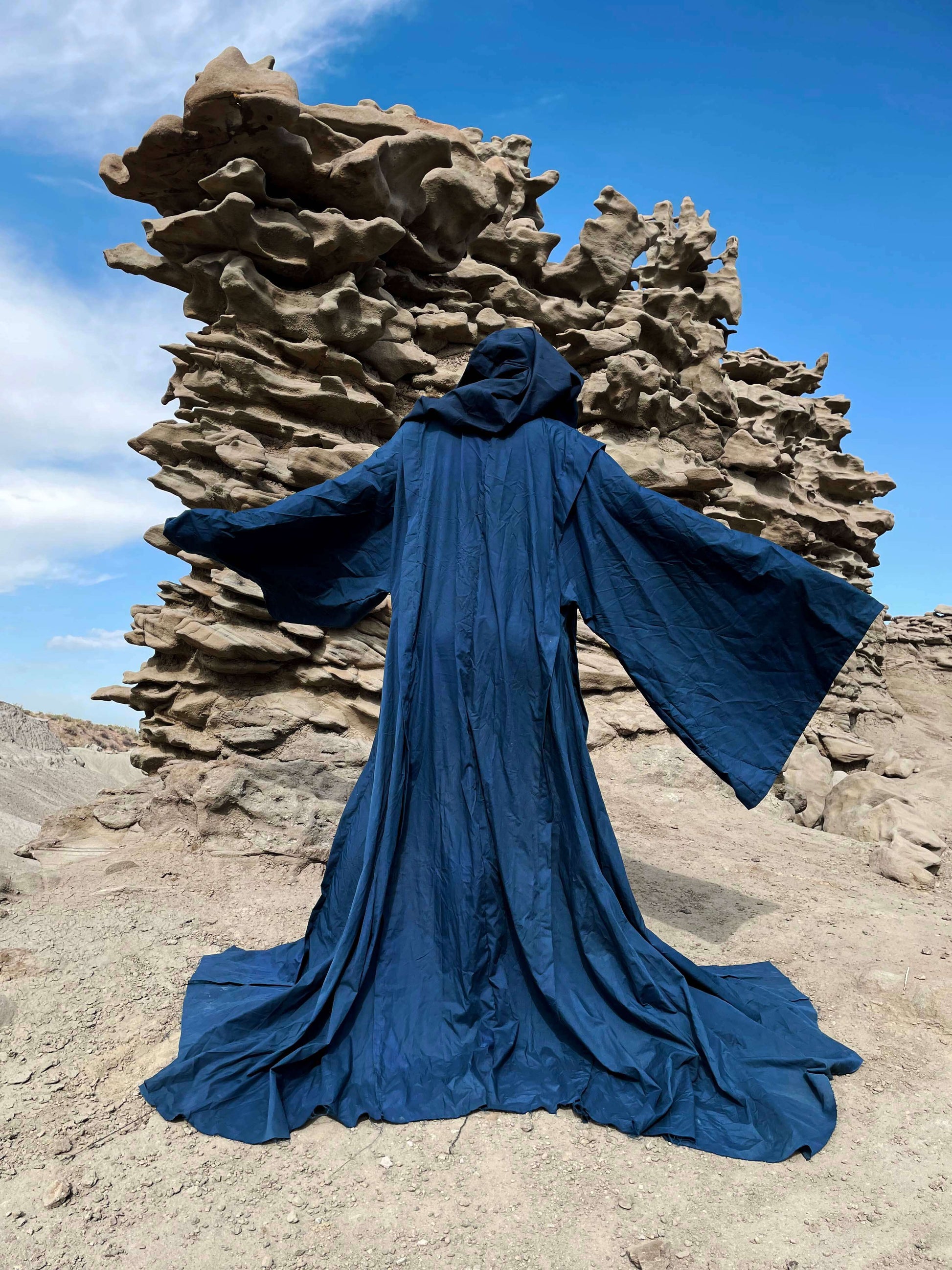 Our Deep Navy Blue Occult Robe with Giant Hood, Oversized Sleeves is made of soft, durable, machine washable, 100% cotton and is handmade to the perfect height. Hand dyed to unique shade. The cloak can be used for many occasions including but not limited to costume and cosplay, theater, ceremonial and occult wear, historical costume, and general warmth and comfort.