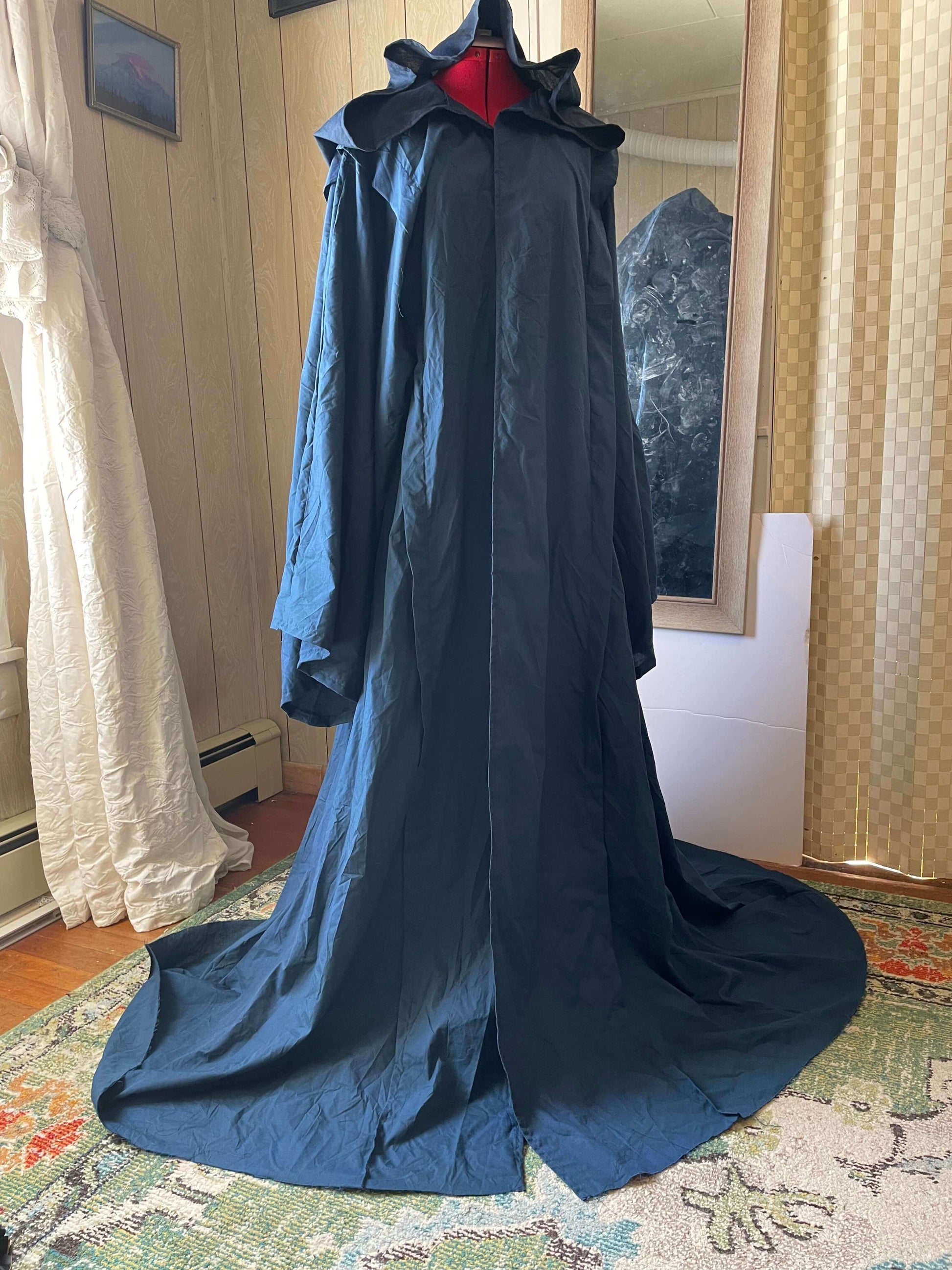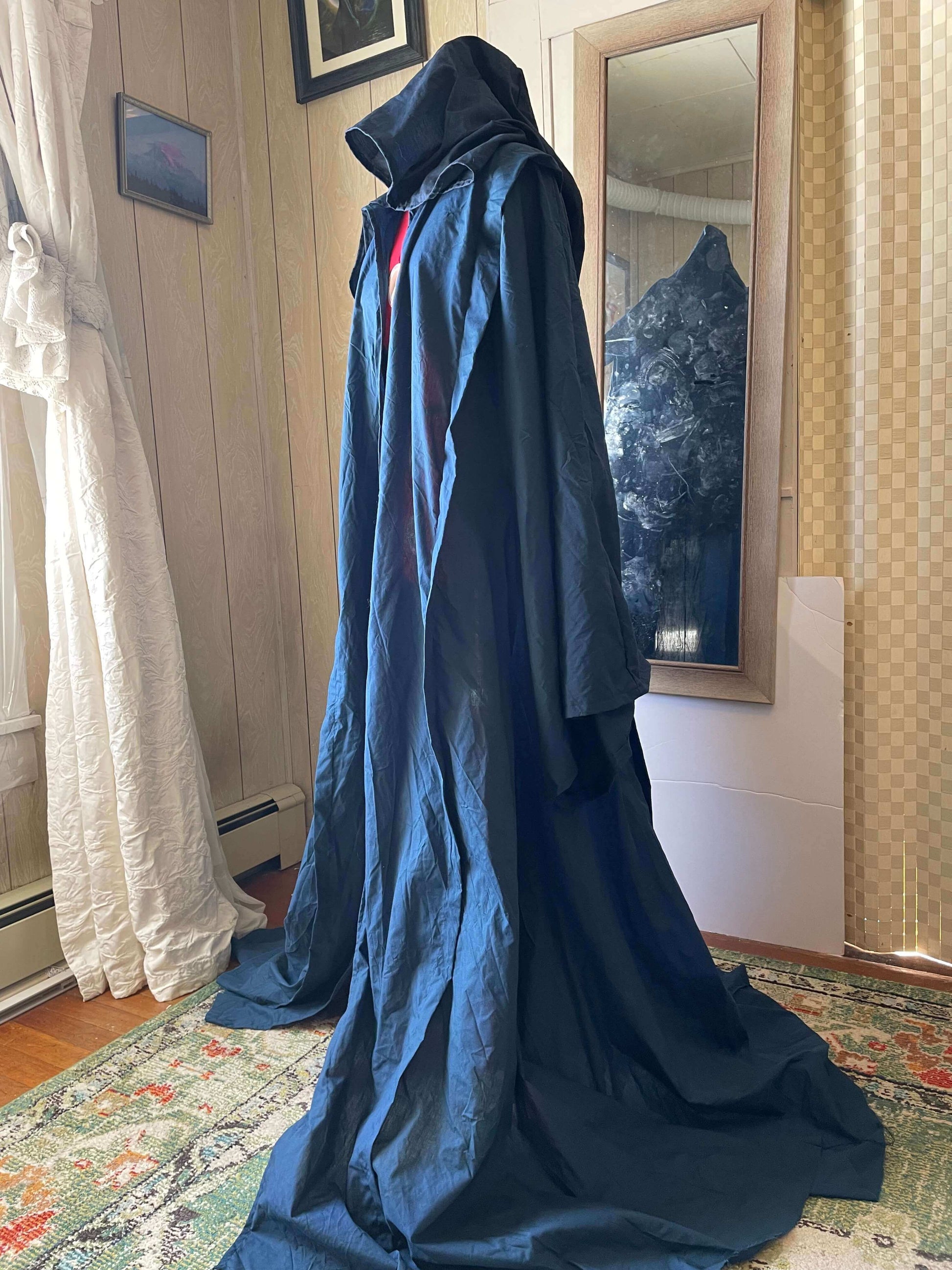 Feel your most mysterious under this giant dark navy hooded occult cloak! This robe is very elegant and moves with the wearer very fluidly as it is long and drapes in a bell like silhouette. Cosplay quality, very real folds and draping, accompanied by the classic oversized hood, perfect for brooding or casting spells under!