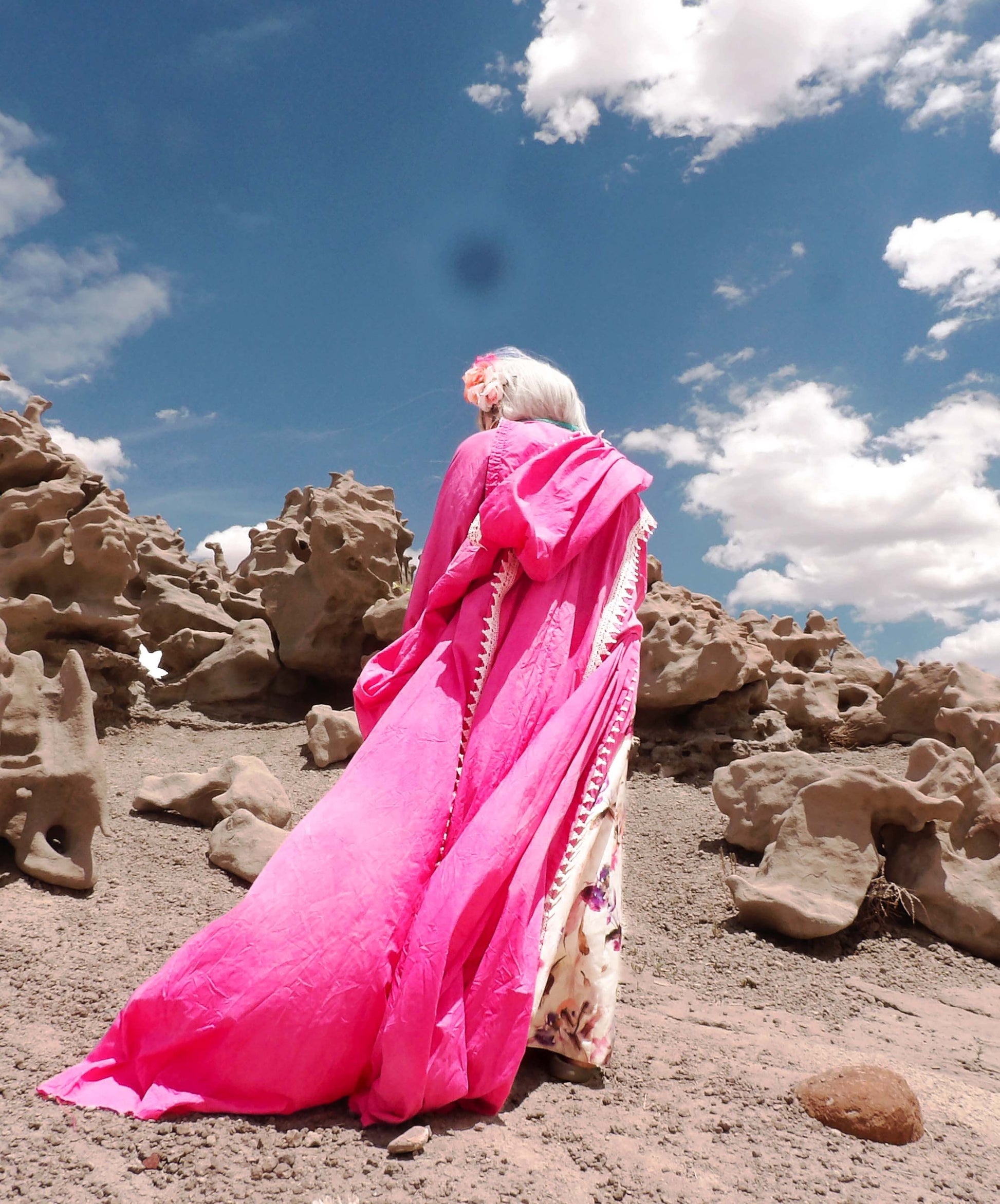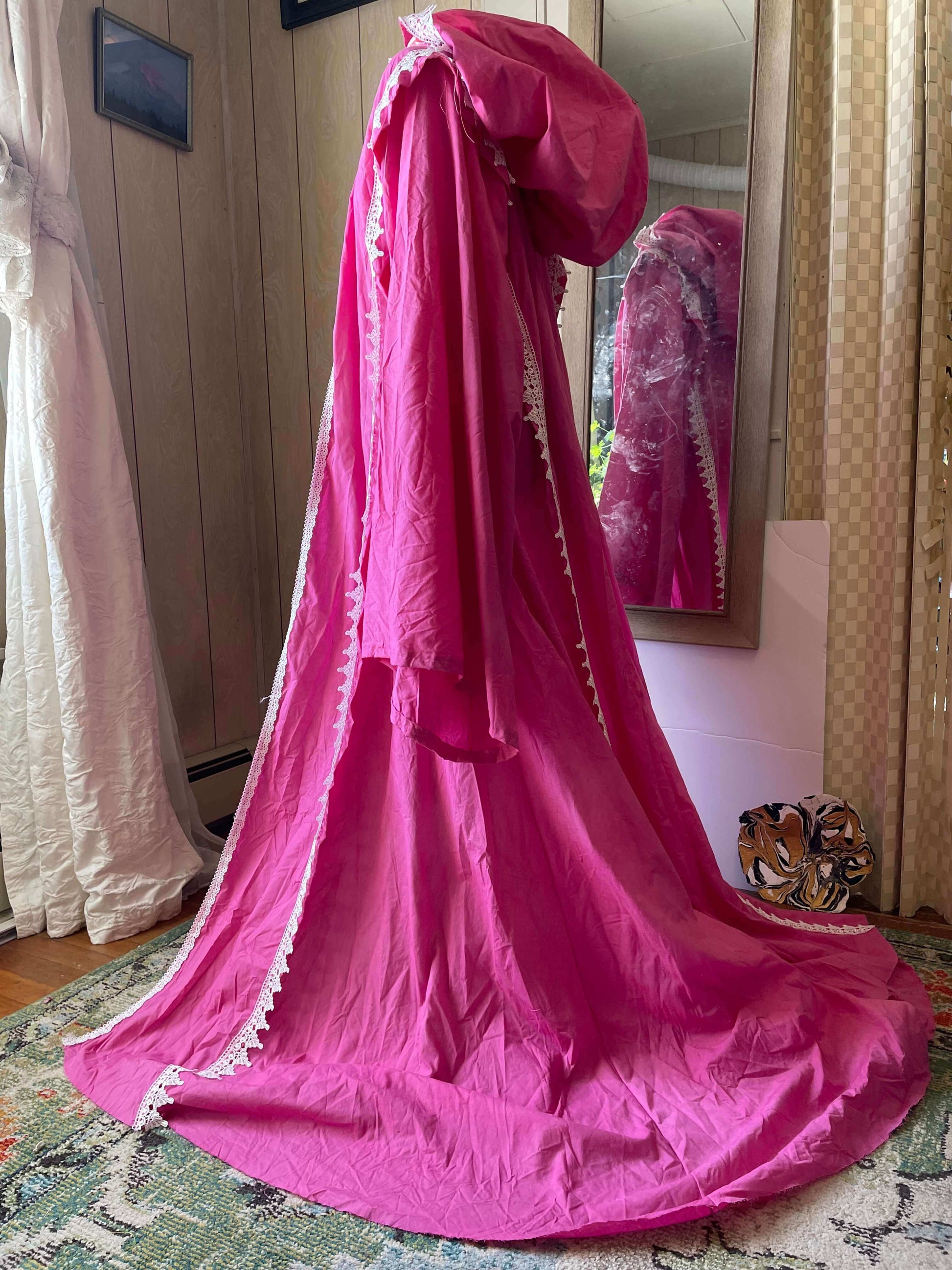 Feel your most mysterious under this giant petal pink hooded occult cloak! This robe is very elegant and moves with the wearer very fluidly, with long but functional drapes, in a bell like silhouette. Cosplay quality, folds and draping, accompanied by the classic oversized hood, perfect for brooding or casting spells under!