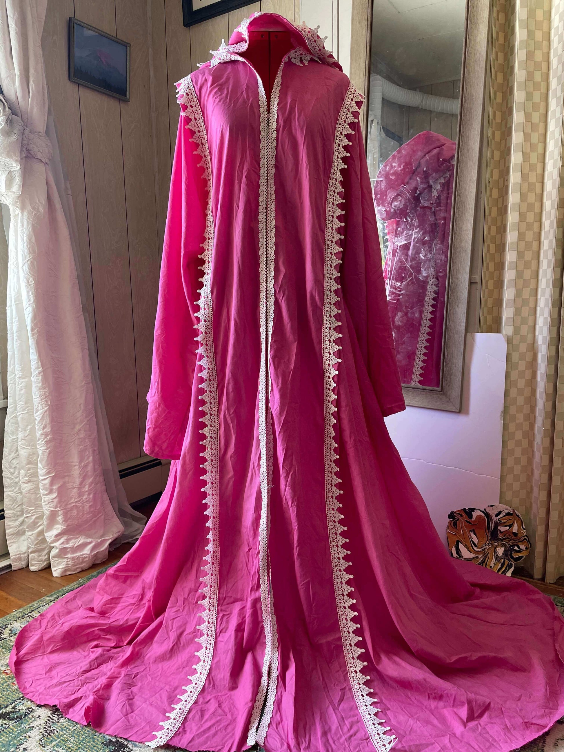 Our Pink Petal Lace Trimmed Full Cloak with Bell Sleeves and Oversized Hood is made of soft, durable, machine washable, 100% cotton and is handmade to the perfect height. The cloak can be used for many occasions including but not limited to costume and cosplay, theater, ceremonial and occult wear, historical costume, and general warmth and comfort. The White Lace trim adorns the hood to the floor and the shoulder seams from floor to shoulders, in front and back.