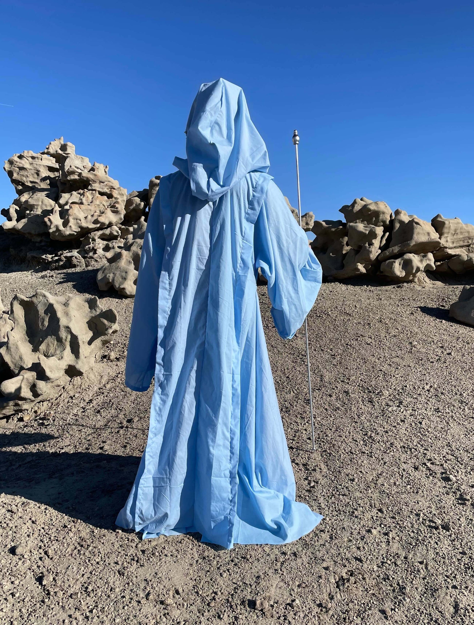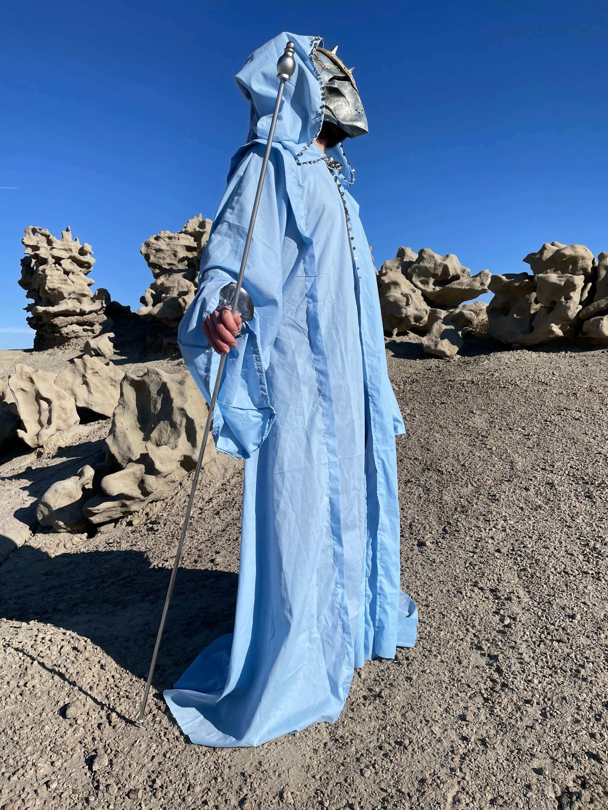 Feel your most mysterious under this giant powder blue hooded occult cloak! This robe is very elegant and moves with the wearer very fluidly, with long but functional drapes, in a bell like silhouette. Cosplay quality, folds and draping, accompanied by the classic oversized hood, perfect for brooding or casting spells under!
