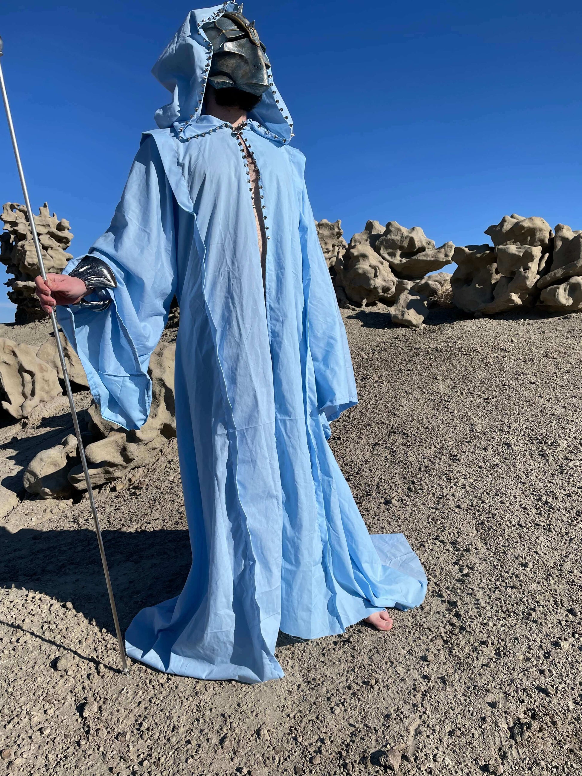 Our Powder Blue Partially Studded Full Cloak with Bell Sleeves and Oversized Hood is made of soft, durable, machine washable, 100% cotton and is handmade to the perfect height. The cloak can be used for many occasions including but not limited to costume and cosplay, theater, ceremonial and occult wear, historical costume, and general warmth and comfort. The studs are hand sewn and adorn the cloak from approximately the mid torso all the way up and across the large hood and back down the other side to mid torso.