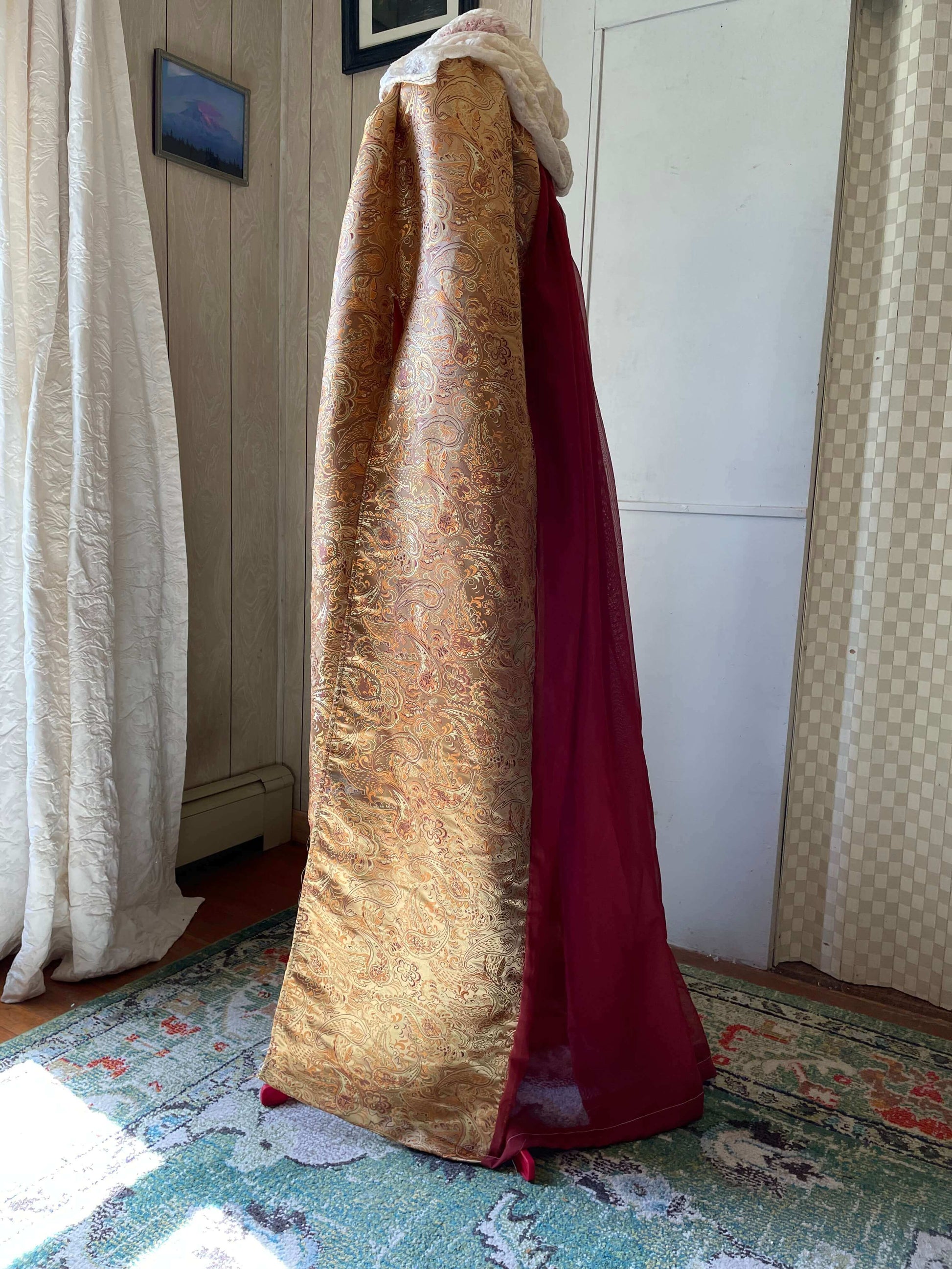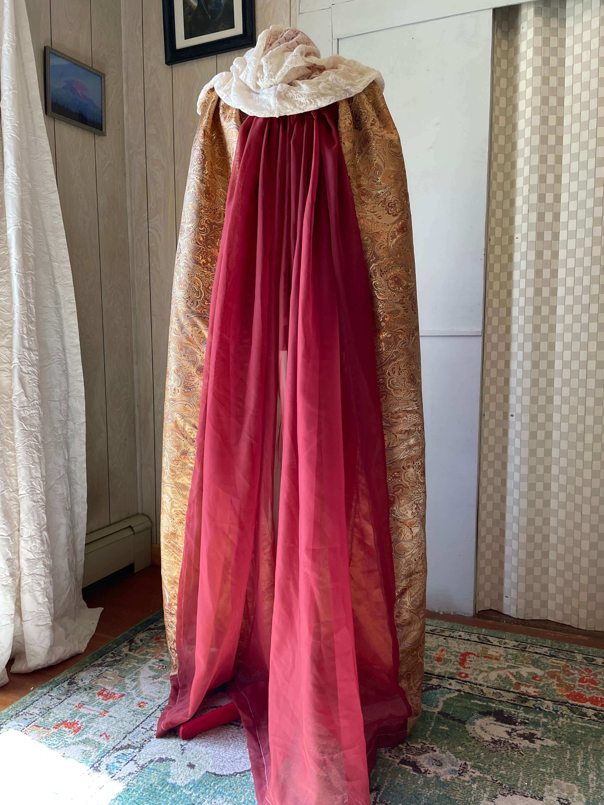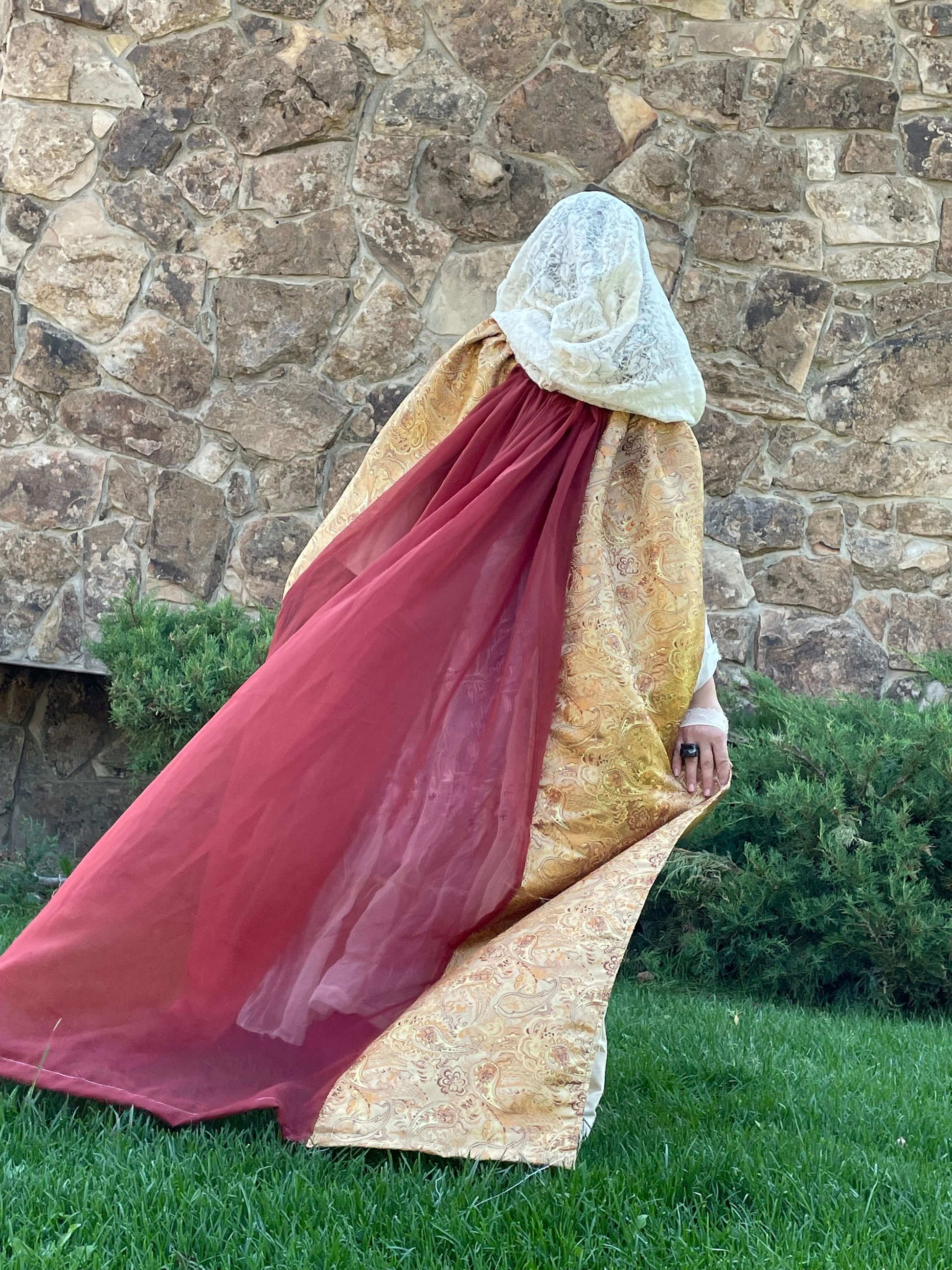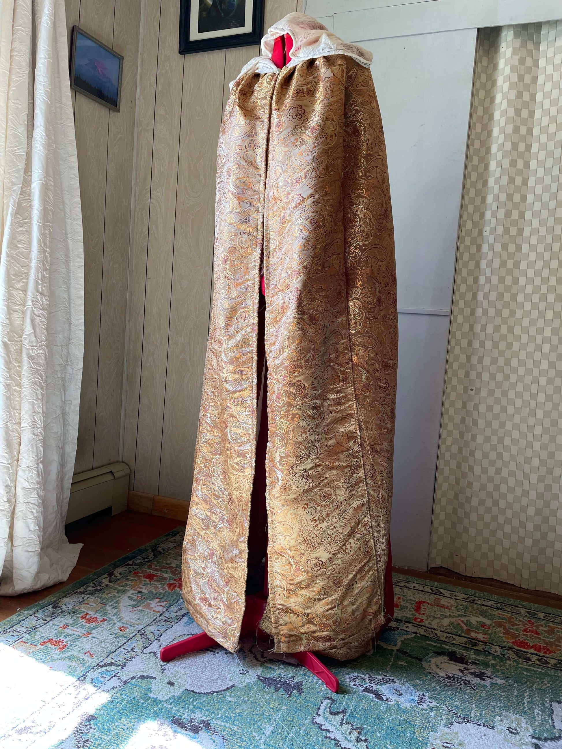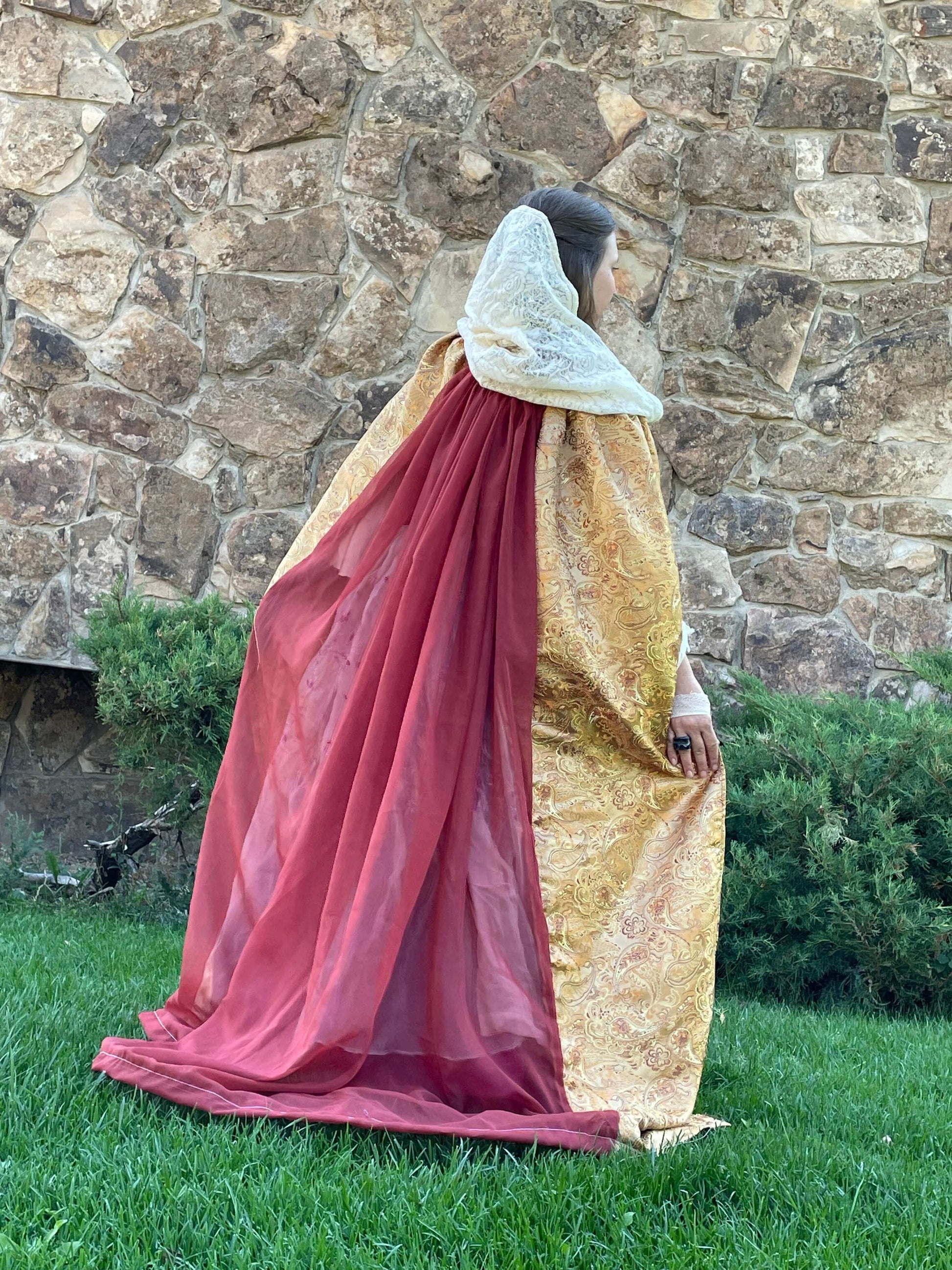 Our Queen’s Golden Cloak features a Golden paisley inspired weave full coverage cloak with an ivory white lace hood that is handmade to order. The Golden fabric is thick, intricate, durable and shiny. The hood is sheer and delicate looking while relatively durable. The back panel of the cloak is sheer, in deep auburn orange.
