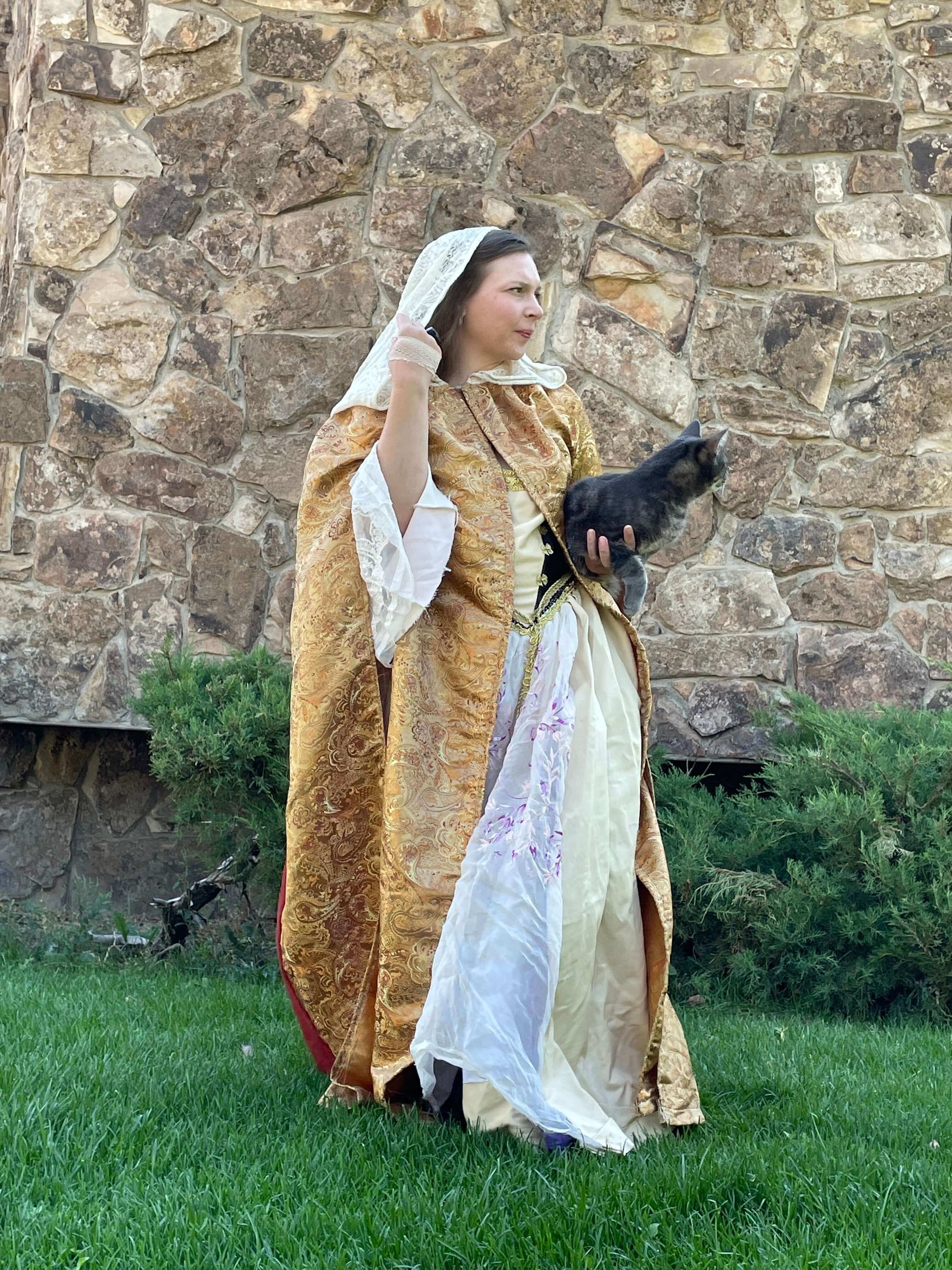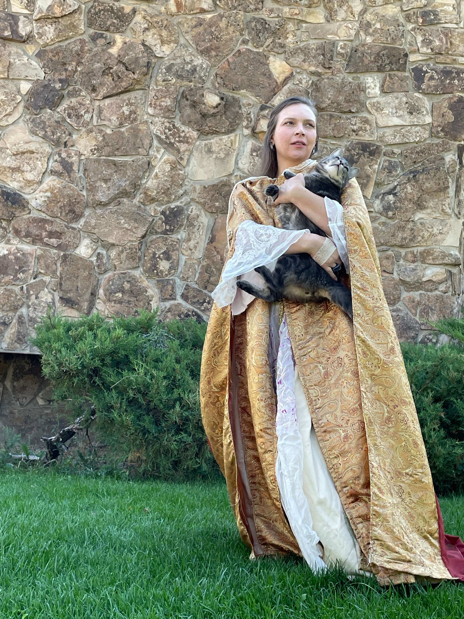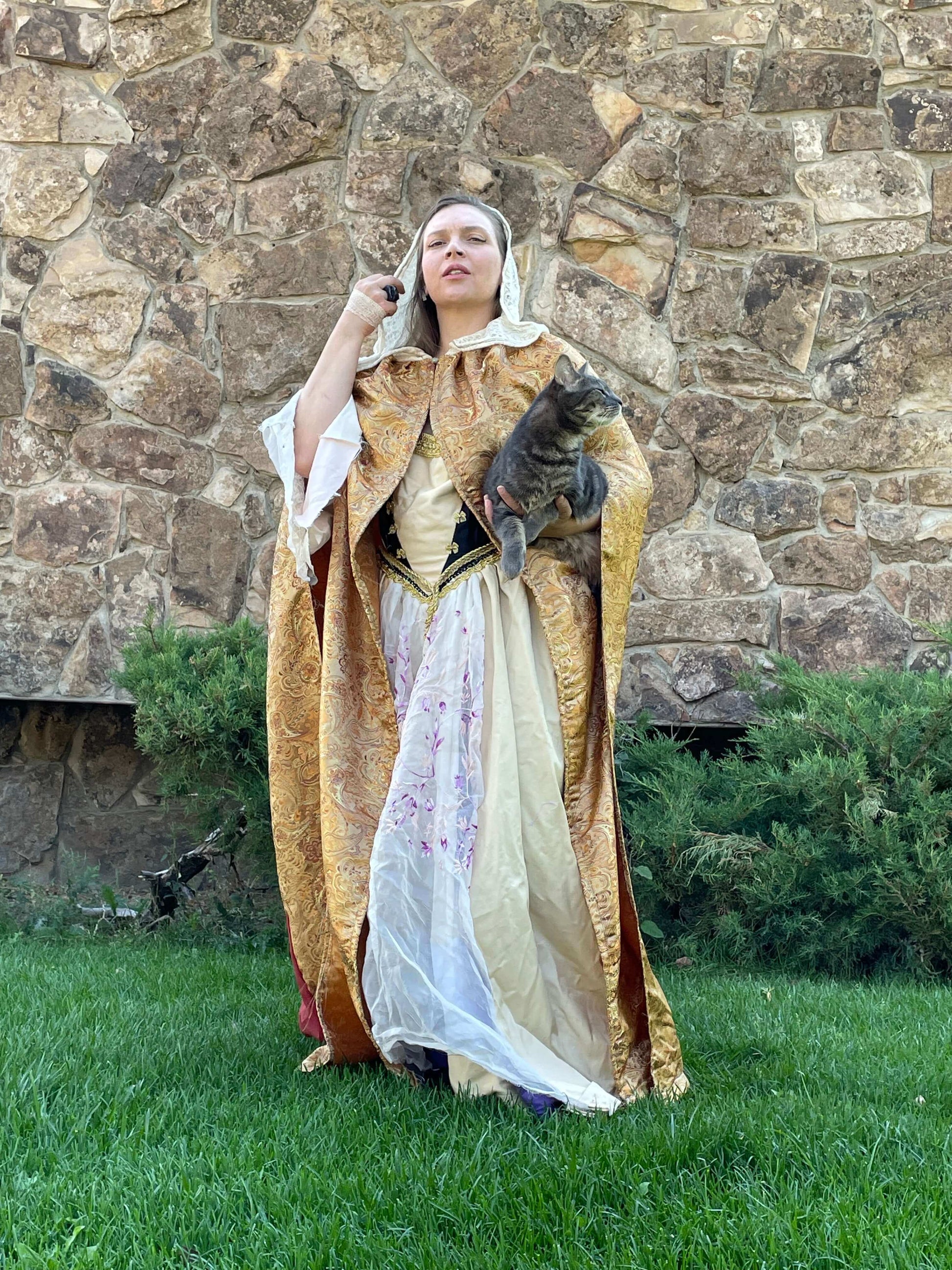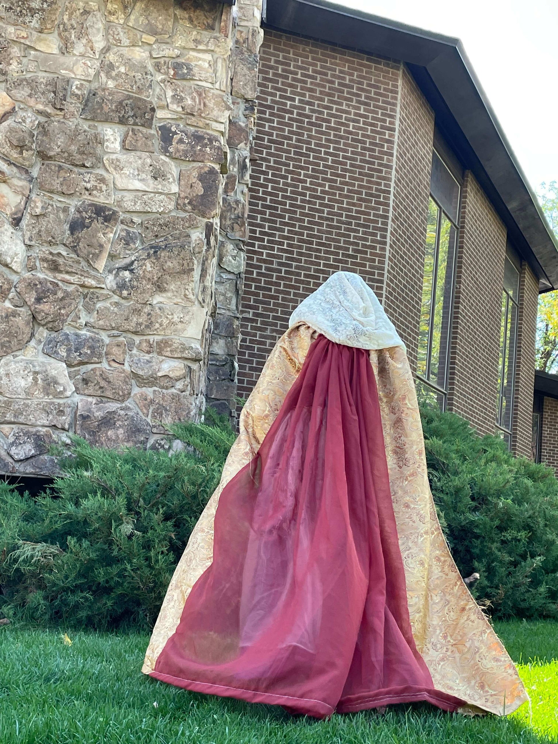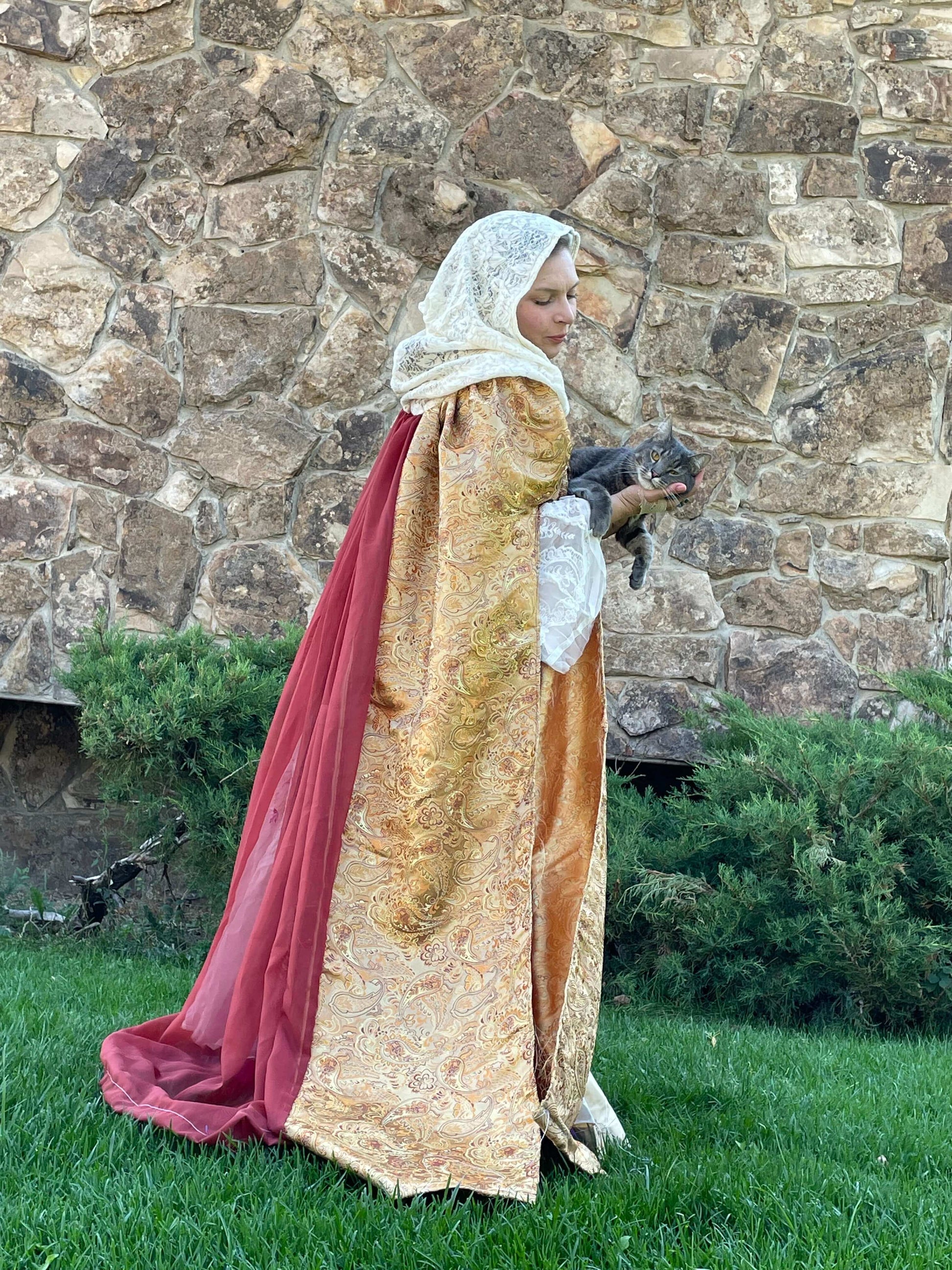 Our Queen’s Golden Cloak features a Golden paisley inspired weave full coverage cloak with an ivory white lace hood that is handmade to order. The Golden fabric is thick, intricate, durable and shiny. The hood is sheer and delicate looking while relatively durable. The back panel of the cloak is sheer, in deep auburn orange.