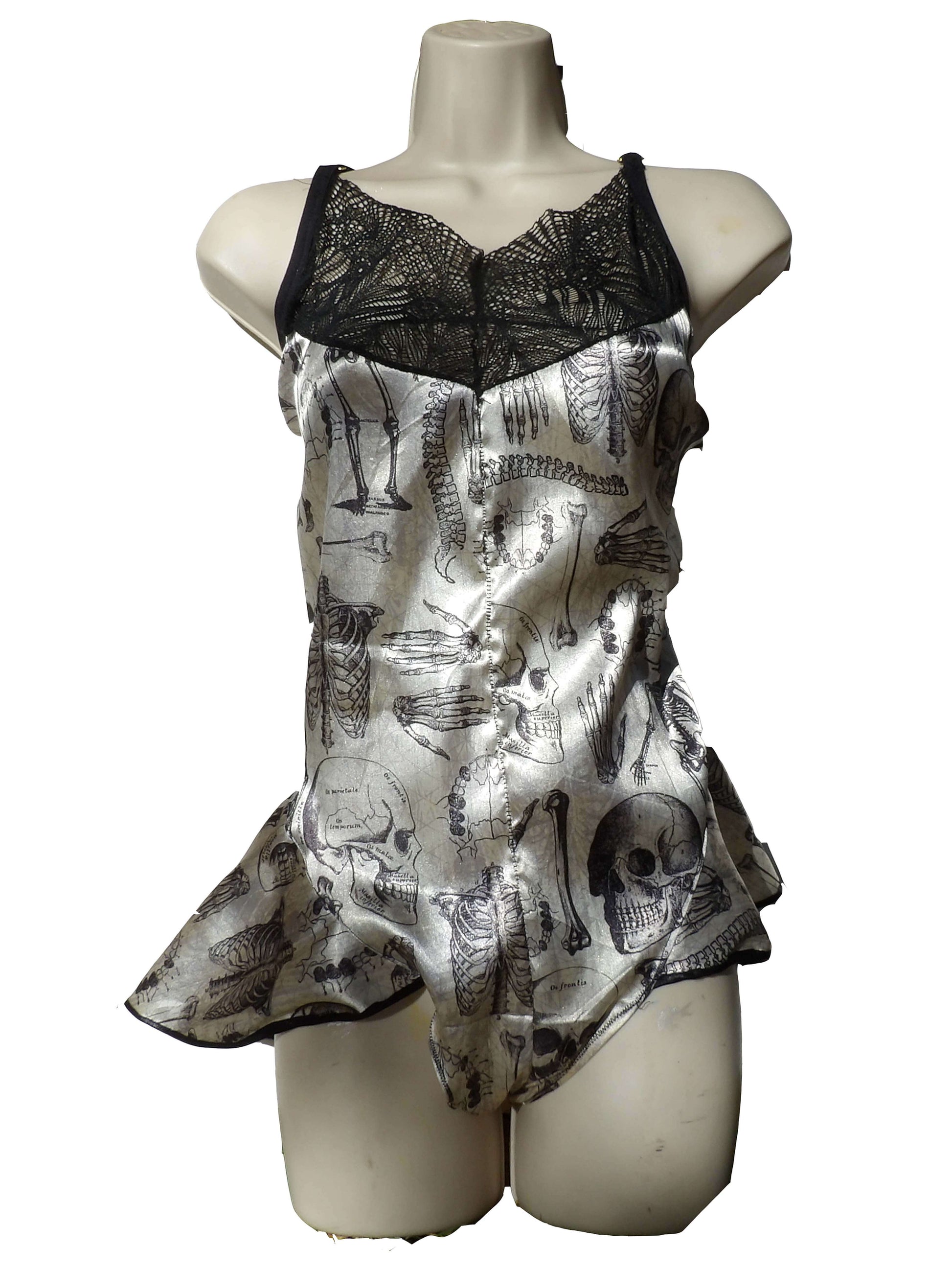 Our Skull Anatomy Teddy Lingerie is a spooky twist on a cute, sexy vintage inspired style. Featuring (mostly) anatomically correct skull and skeleton diagrams and references with beautiful detail on a silk satin fabric with hand dyed eyelet lace trim bust and hand cut spandex trim at flounce. High cut at sides and back, very flattering v cut back. adjustable, convertible straps.