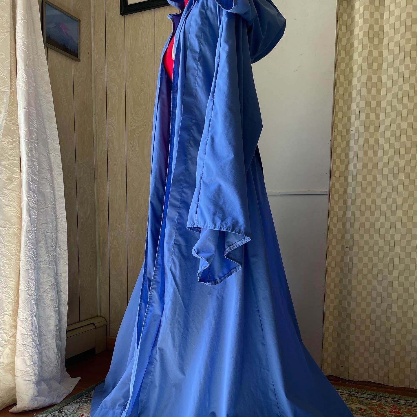 Feel your most mysterious under this giant light blue hooded occult cloak! This robe is very elegant and moves with the wearer very fluidly as it is long and drapes in a bell like silhouette. Cosplay quality, very real folds and draping, accompanied by the classic oversized hood, perfect for brooding or casting spells under!