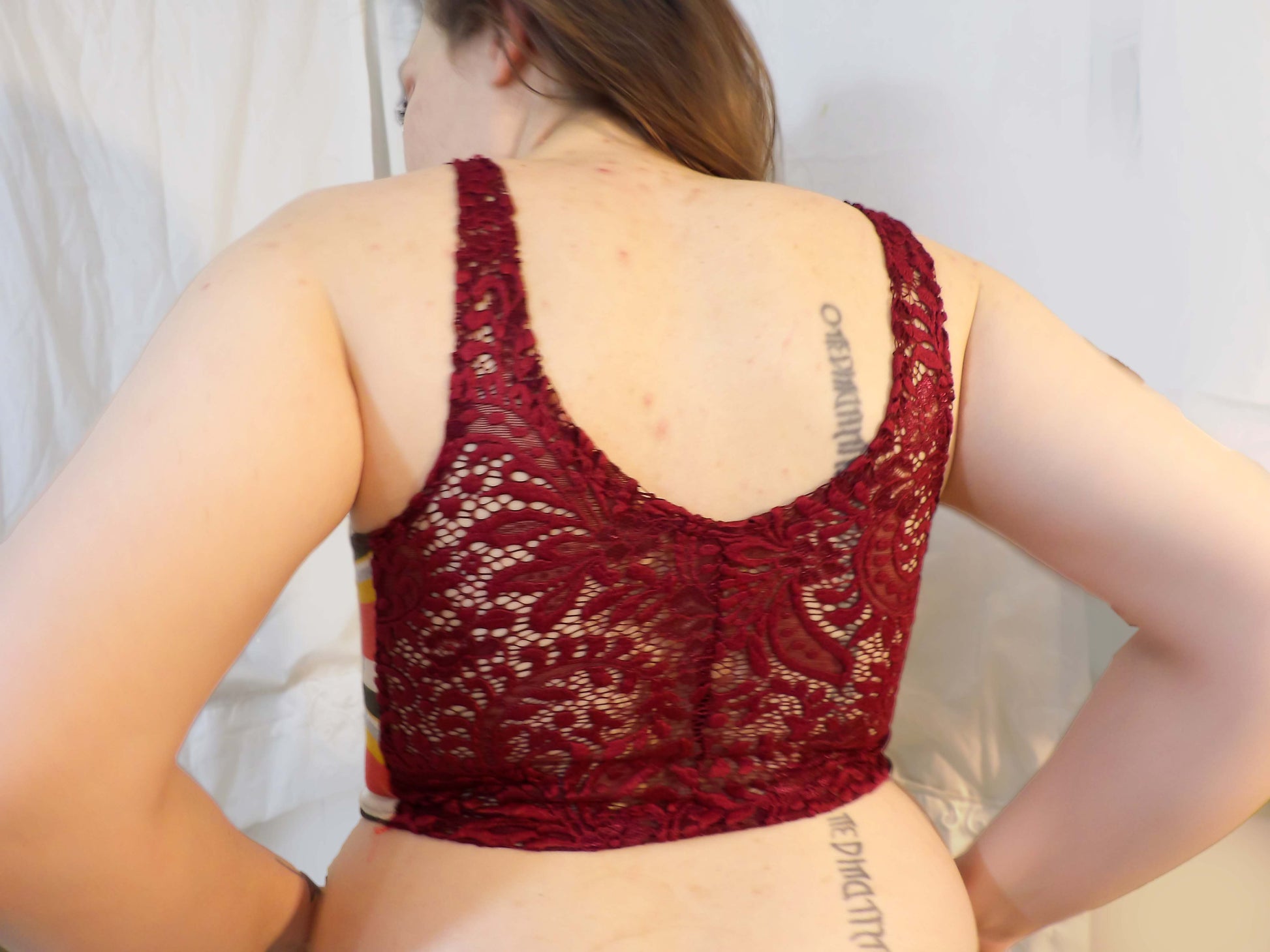 Our Striped with Burgundy Lace crop tank top is sexy, cute, and unique! Featuring a classic tank top cut, cropped, in a striped stretch knit front and sheer floral lace back. Sheer panel detail and center front and mock boning ribs create gorgeous and flattering front detail. Scoop neck.