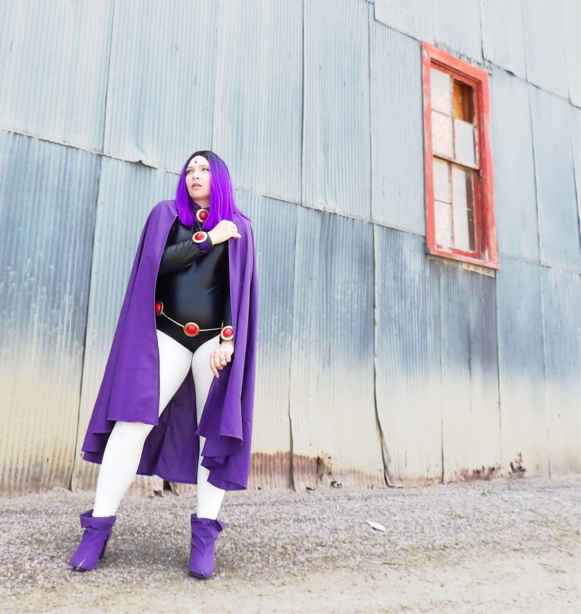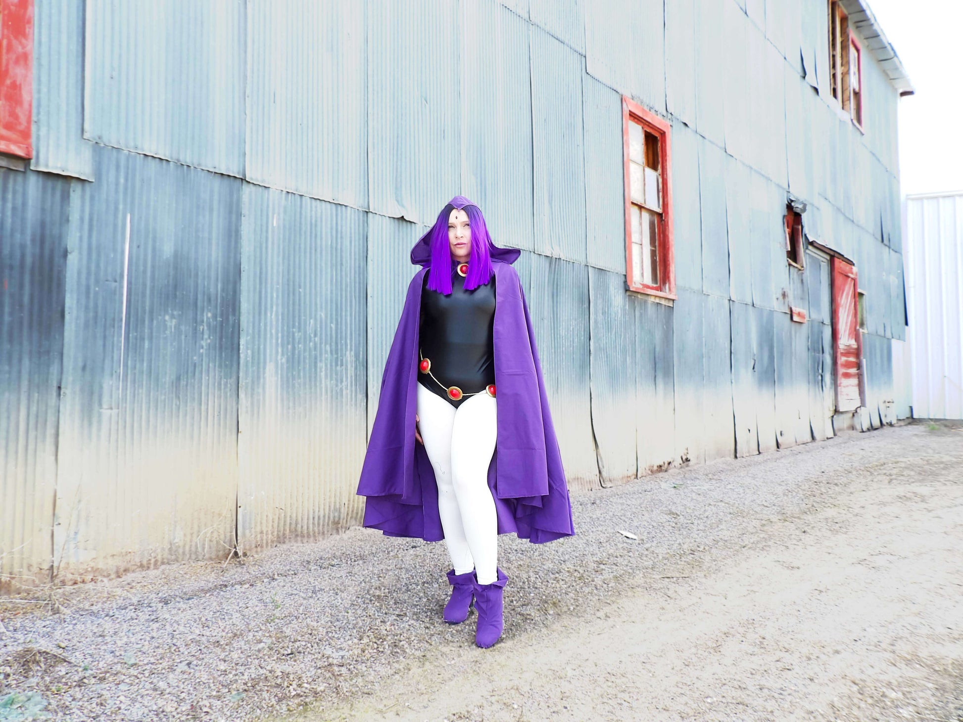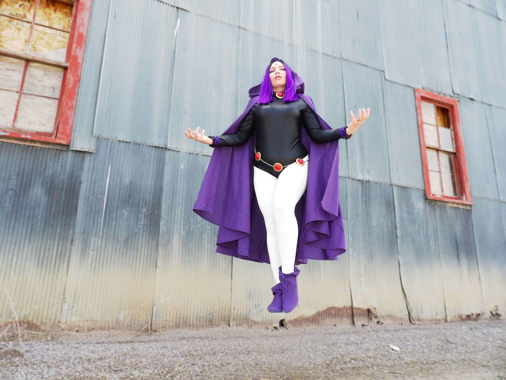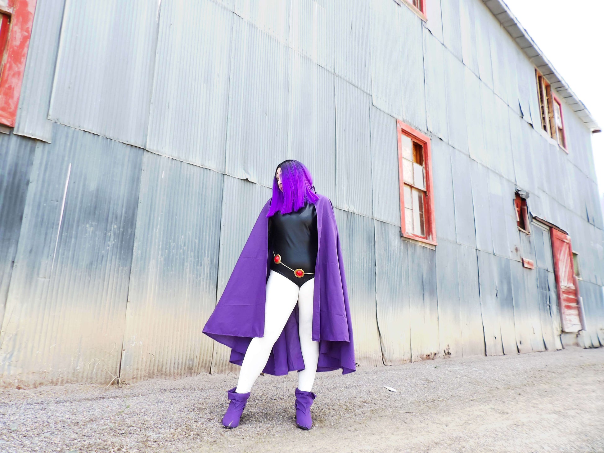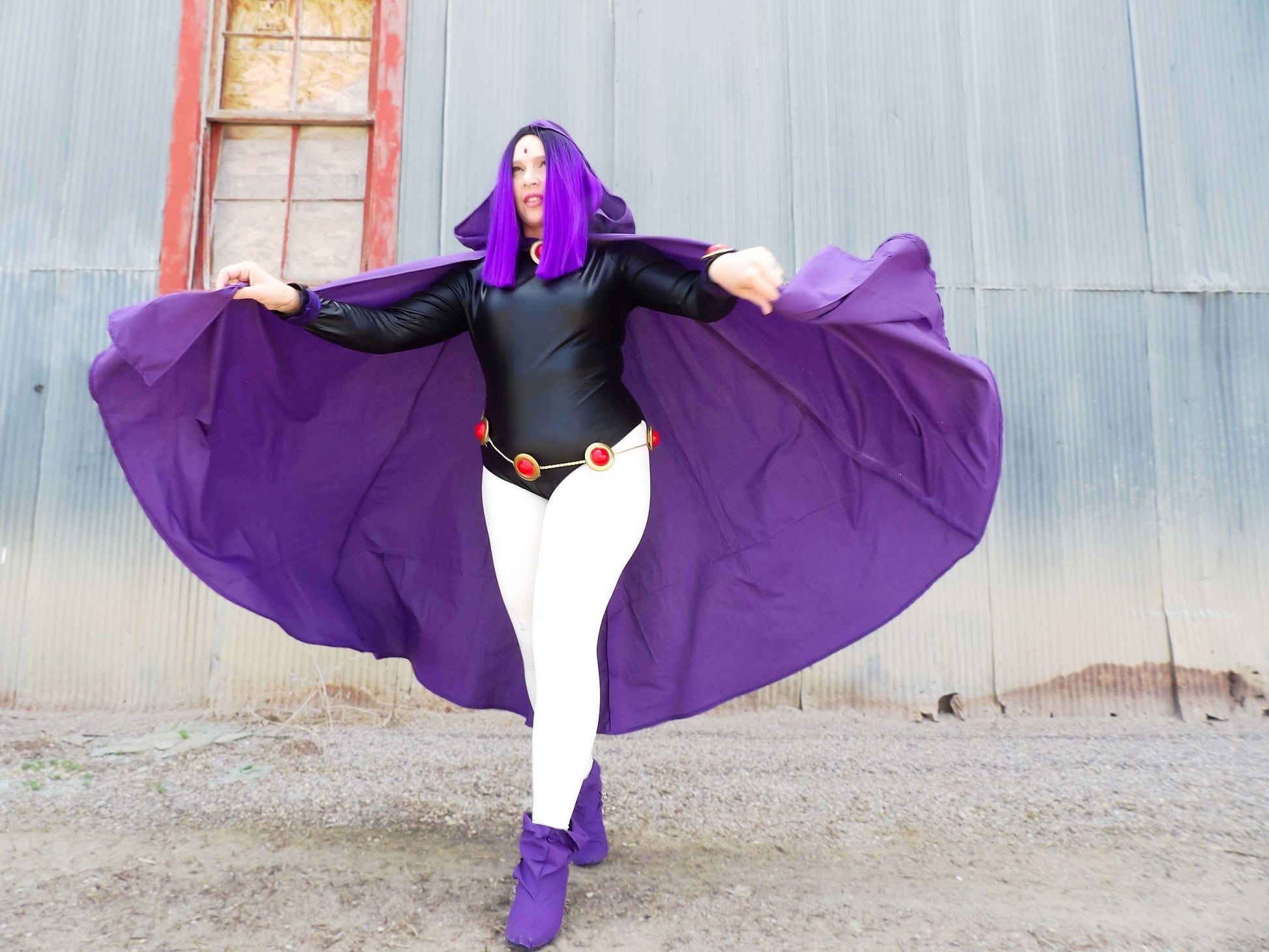 Our Sleek Black Teddy Teen Titans Raven Inspired Bodysuit, Fitted Cape with exaggerated hood, and Purple Wrist Bands is perfect for any Raven Cosplay! Or perfect to wear while doing chores around the house, eating pizza out of the box with Beast Boy, reading incantations,?meditating, or fighting crime!