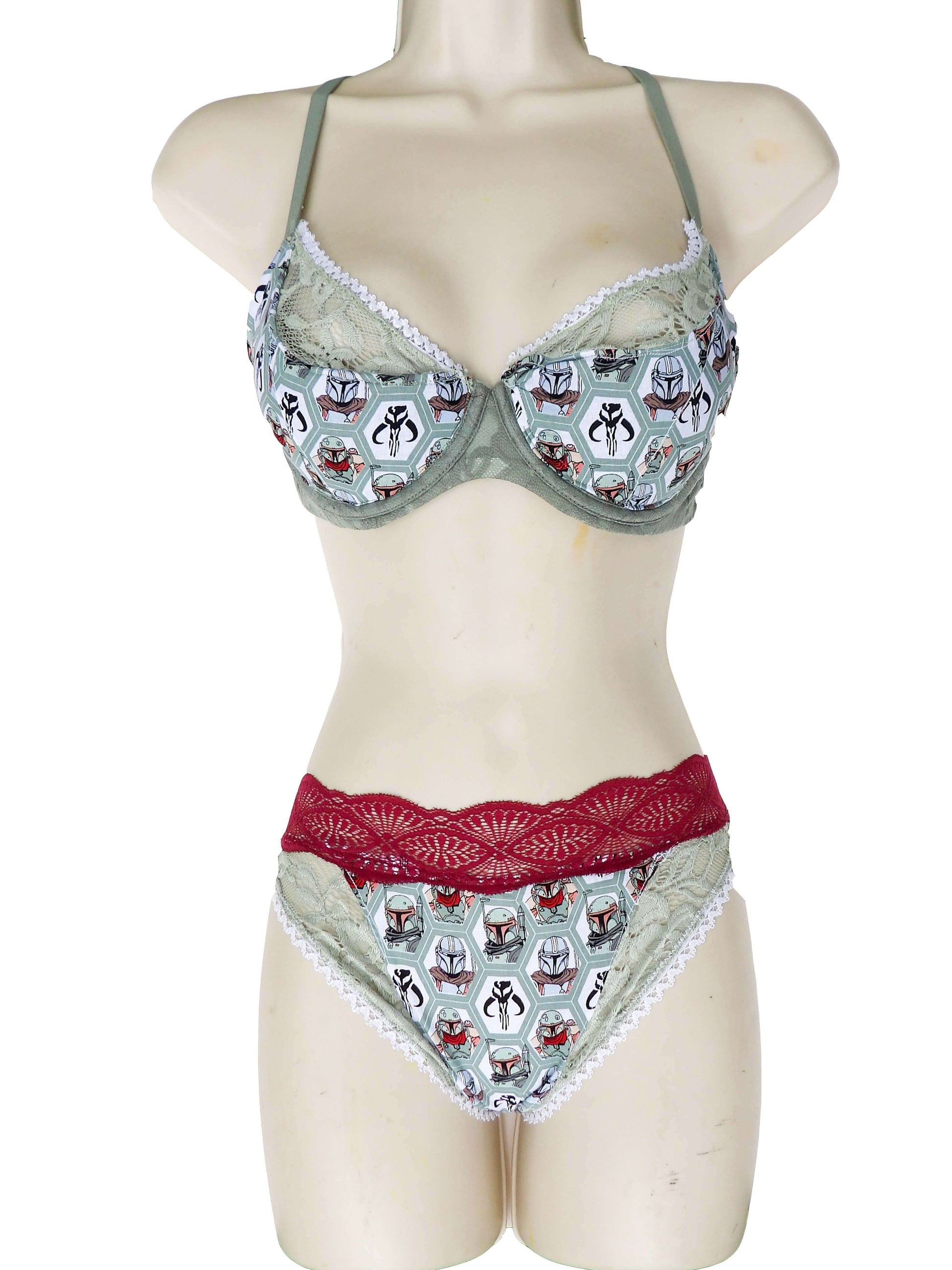 Our Mandalorian Helmets and Lace Half Cup Demicup Bra Tshirt Bra Is the ultimate everyday geek gear essential, featuring unique Mandalorian Helmet themed print fabric, luxury lace, in a flattering and flirty cut. This low-cut and unique, balconette is comfortable and flattering. The cups are lightly lined, so it looks great under attire, but so fierce and flattering without!