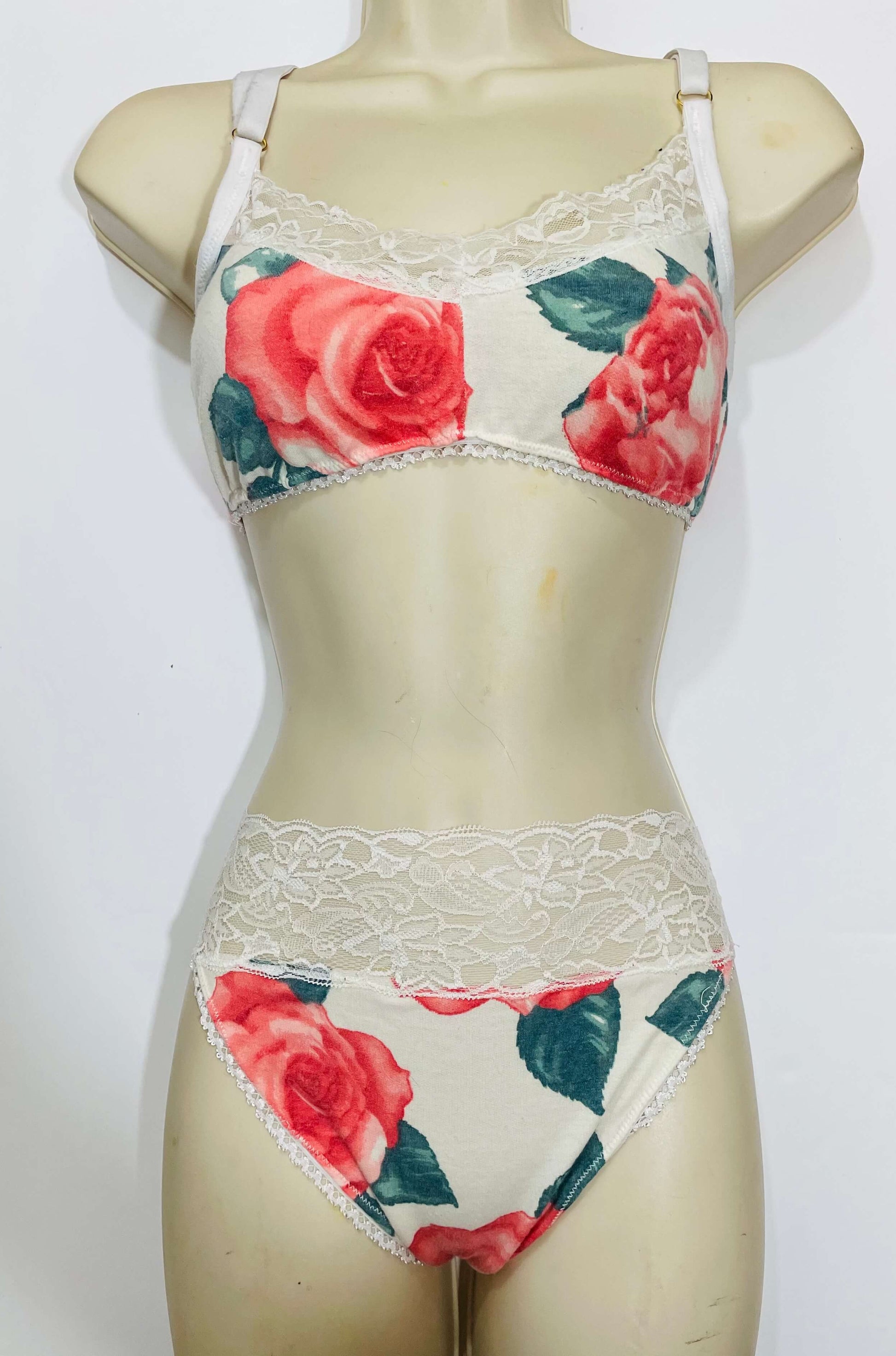 Our Watercolor Roses Essential Bralette in Pink is a sweet and delicate comfort wear essential, featuring a detailed, soft and stretchy hand curated Jersey knit fabric with scalloped floral lace trim and soft, adjustable straps.